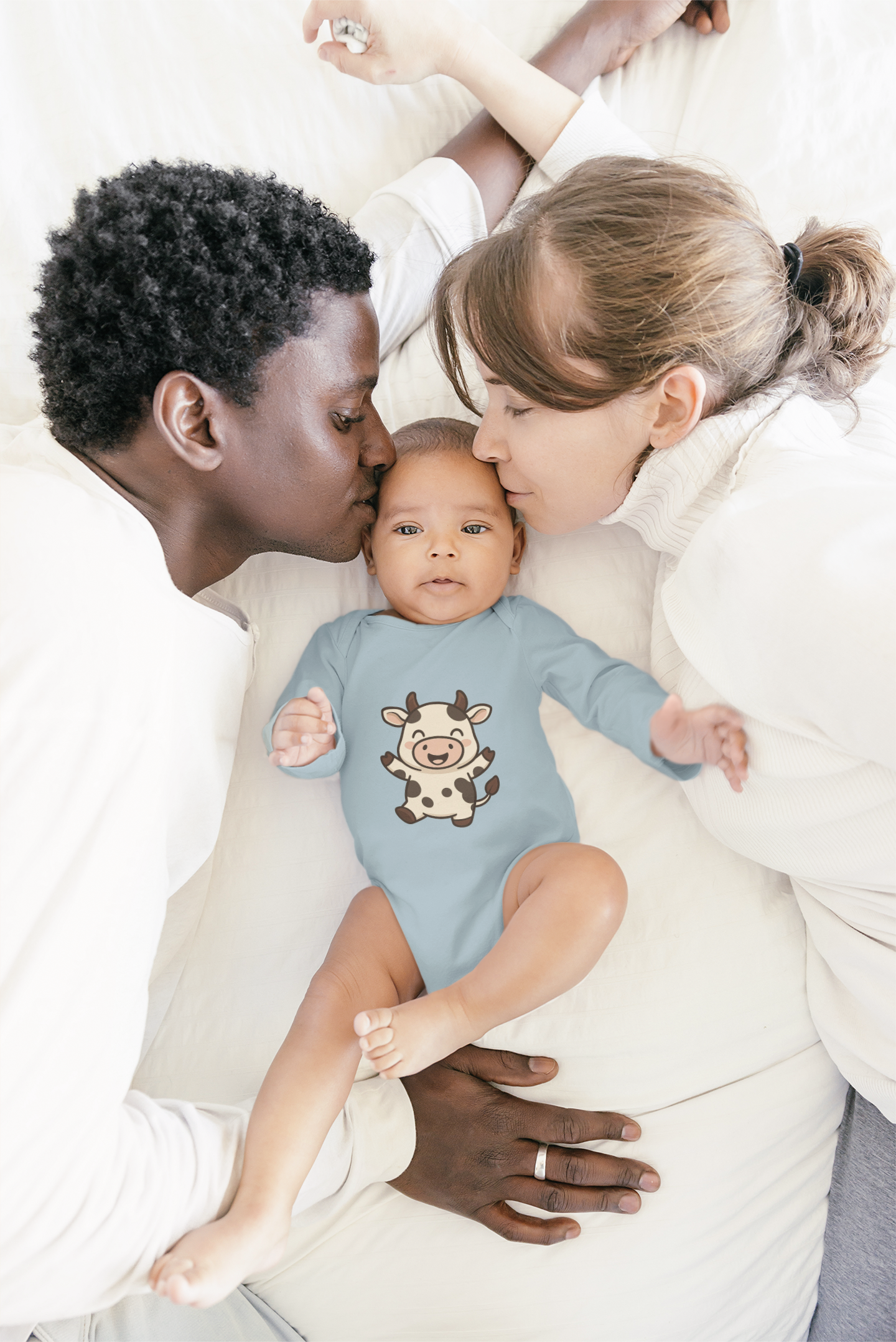Soft and sleepy mornings meet playful barnyard charm. This infant bodysuit carries a sweet cow motif—small, simple, and full of personality—so your little one can nap, wiggle, and grow in comfort. The lightweight, smooth fabric drapes gently against delicate skin and the ribbed neck and leg openings move with each stretch and kick. Snaps at the crotch make quick diaper changes easy, while the side seams keep the shape wash after wash. Whether it's a casual day at home, a family farm visit, or a quiet newborn photo, this bodysuit layers easily under sweaters or pairs with tiny overalls to create an effortlessly cozy look that feels like home.
