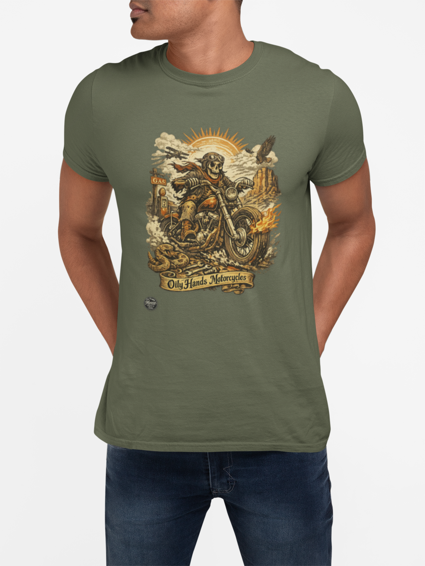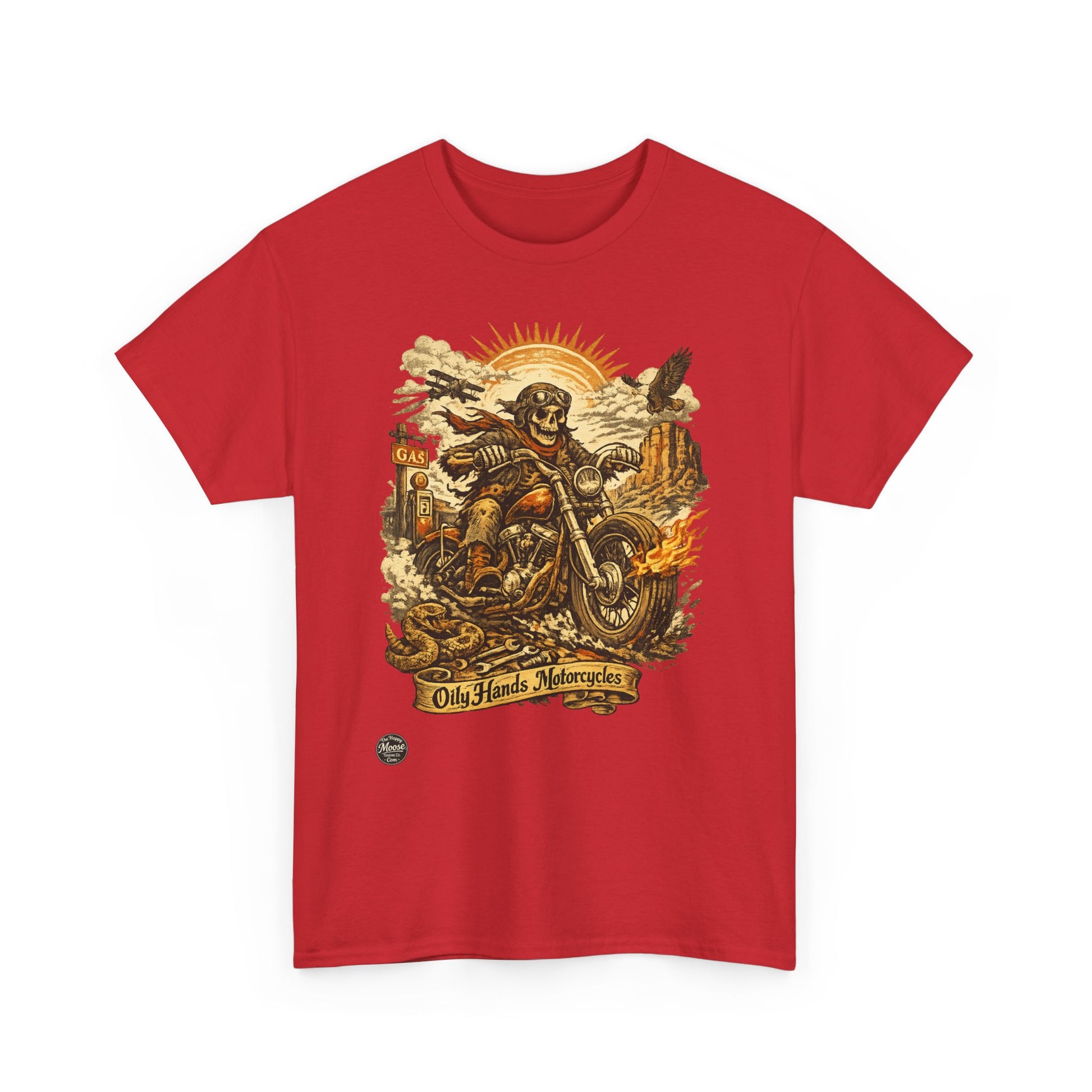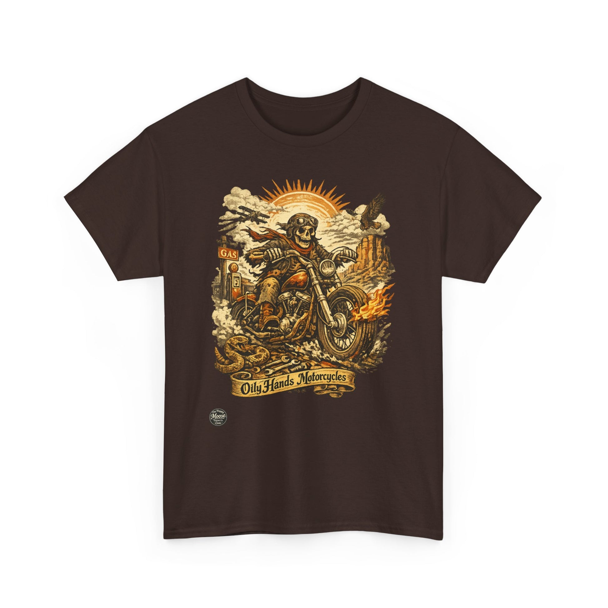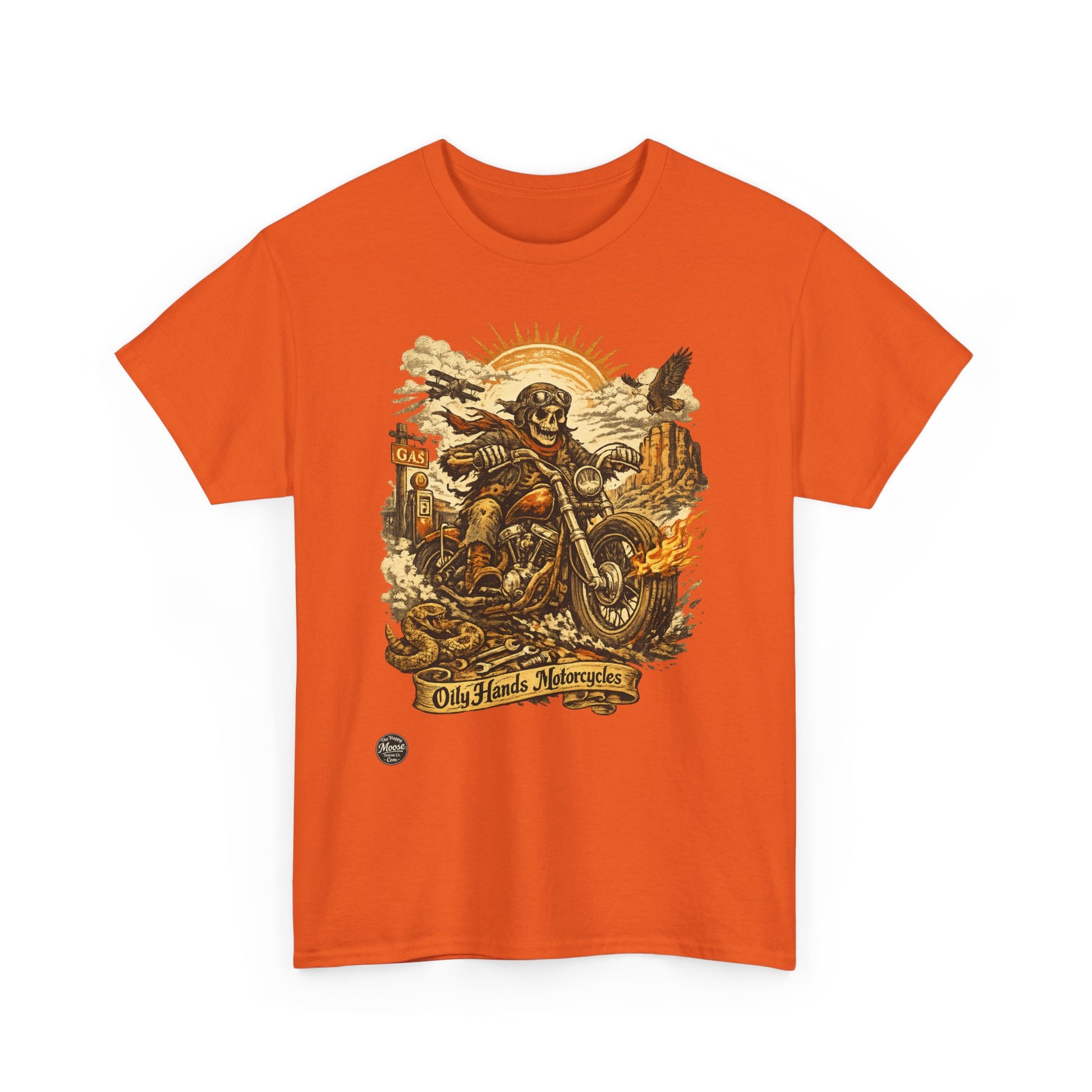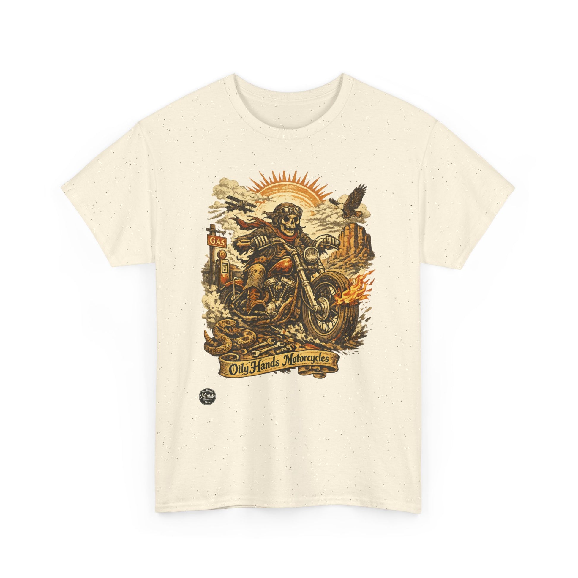 Oily Hands Motorcycle Skull Tee — Old Friends Vintage Biker T-Shirt #015 E