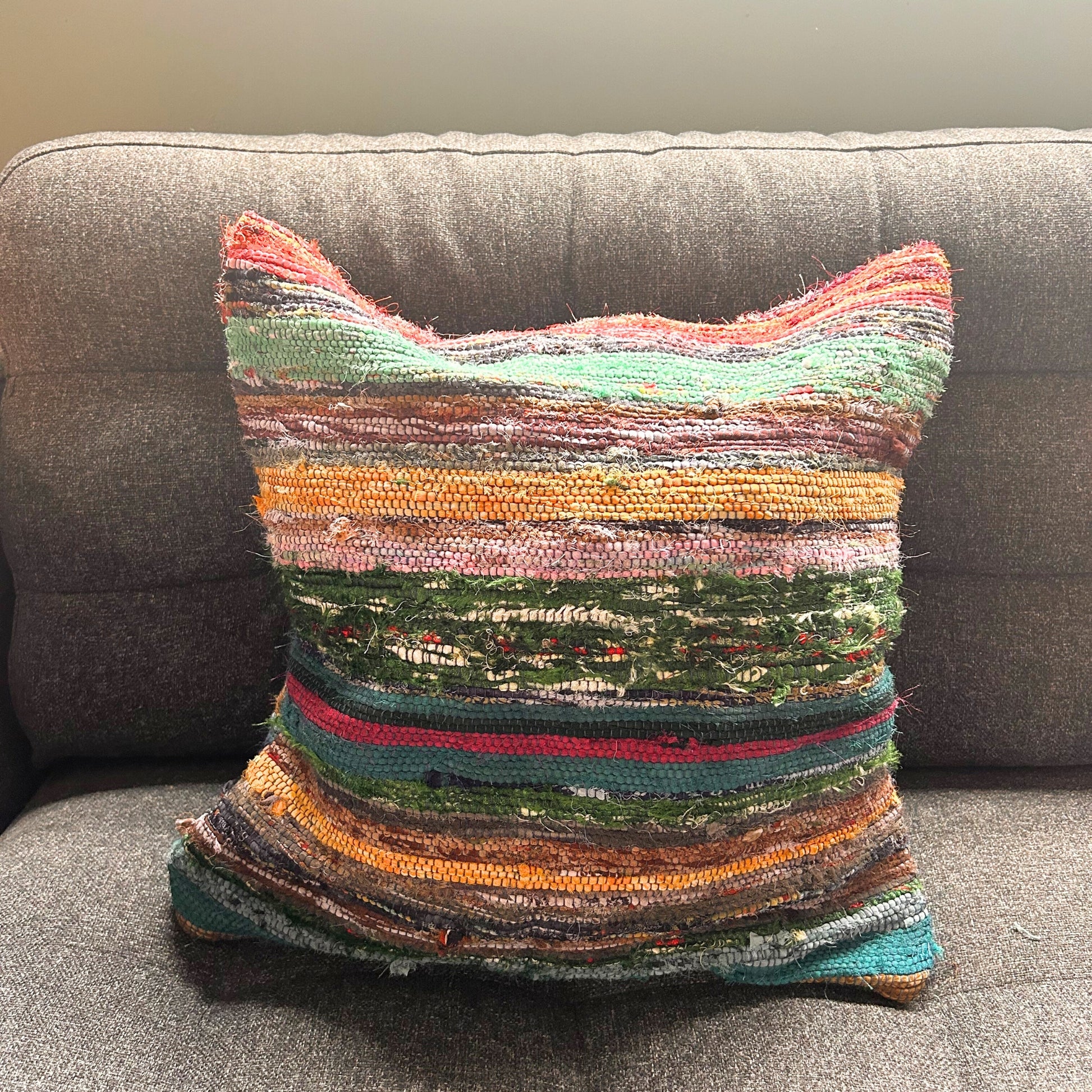 Erhältlich in sechs verschiedenen und auffälligen Varianten – Mehrfarbig, Naturgrün, Sonnenaufgangsorange, Anthrazitgrau, Aquablau und Kräftiges Rot – setzen diese Kissenbezüge einen farbenfrohen Akzent in jeder Wohneinrichtung. Sie sind die perfekte Ergänzung zu unseren indischen Flickenteppichen.
