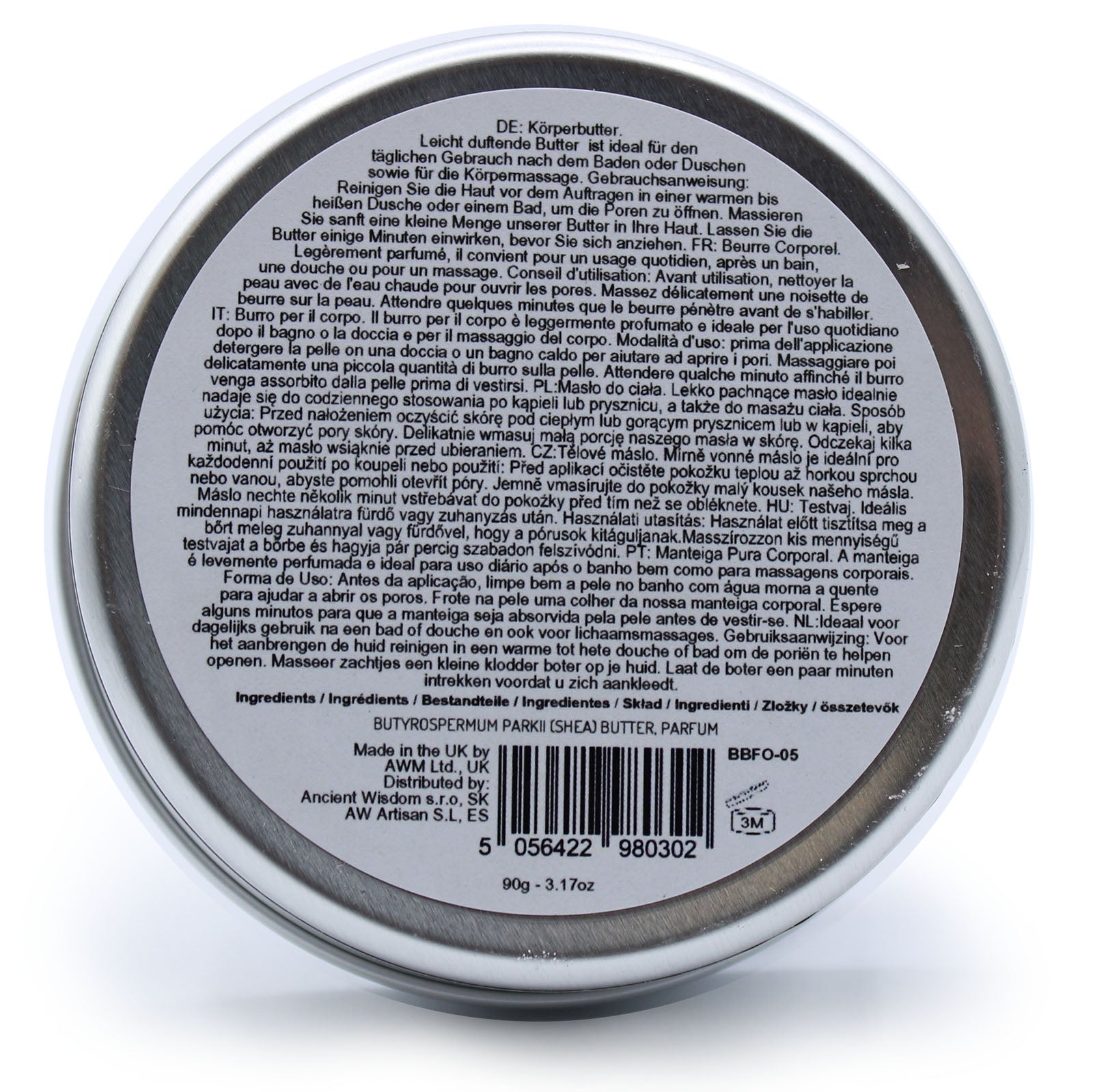 Die leicht duftende Sheabutter mit hochwertigen Duftölen eignet sich ideal für die tägliche Anwendung nach dem Baden oder Duschen sowie für Körpermassagen. Die Konzentration an natürlichen Vitaminen und Fettsäuren in der Sheabutter spendet Feuchtigkeit und pflegt die Haut. Ihr hoher Fettgehalt macht sie zu einem hervorragenden natürlichen Weichmacher und Feuchthaltemittel, das Feuchtigkeit speichert und die Haut mit Feuchtigkeit versorgt. Sie sorgt dafür, dass die natürlichen Öle der Haut erhalten bleiben. Das Ergebnis: schöne und glatte Haut.