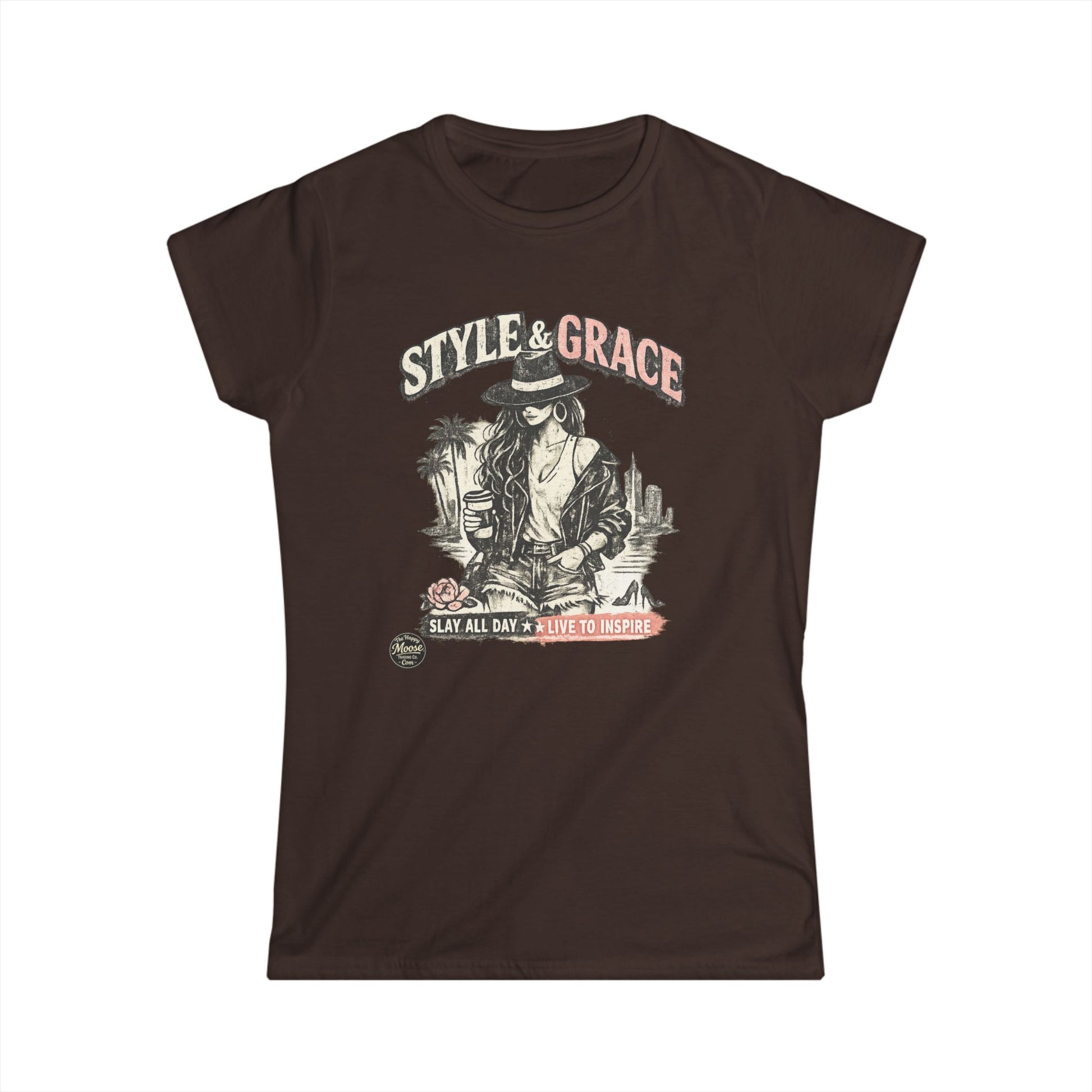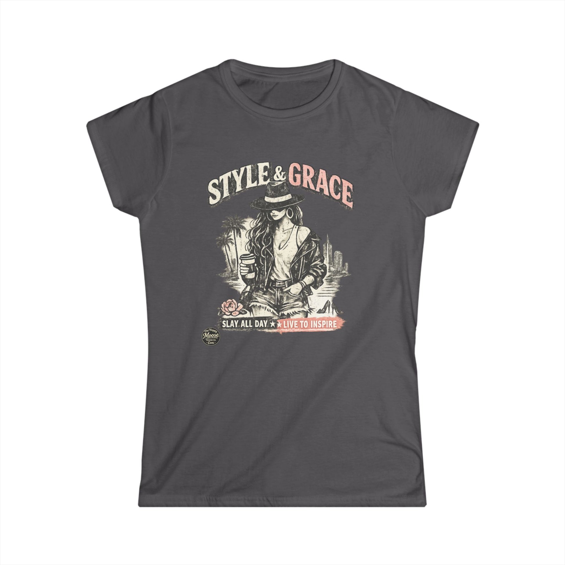 This lightweight, semi-fitted tee brings vintage rocker vibes to casual days — a soft cotton shirt that layers easily and holds its shape after many wears. The front features a distressed, retro-inspired graphic of a confident, wide-brimmed figure among palms and sunset tones, labeled “Style & Grace,” giving the shirt an effortless, lived-in look. Wear it solo with denim for an everyday rebellious edge, or tuck it into a high-waist skirt for a softer contrast. The tear-away label and ribbed collar keep things comfortable; reinforced hems and shoulder tape mean it won’t lose its silhouette after repeated washes. For folks who love music, road trips, and sunset hangs, this tee feels like a familiar playlist you reach for again and again.