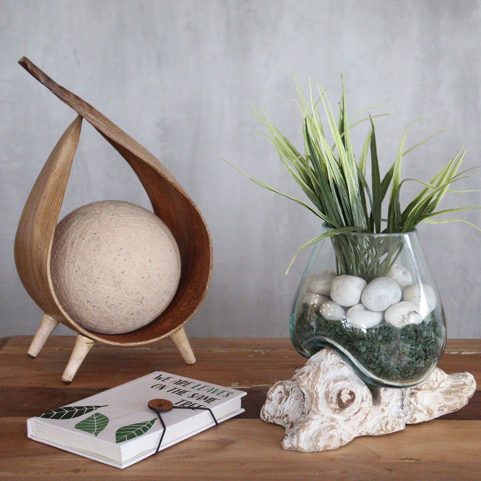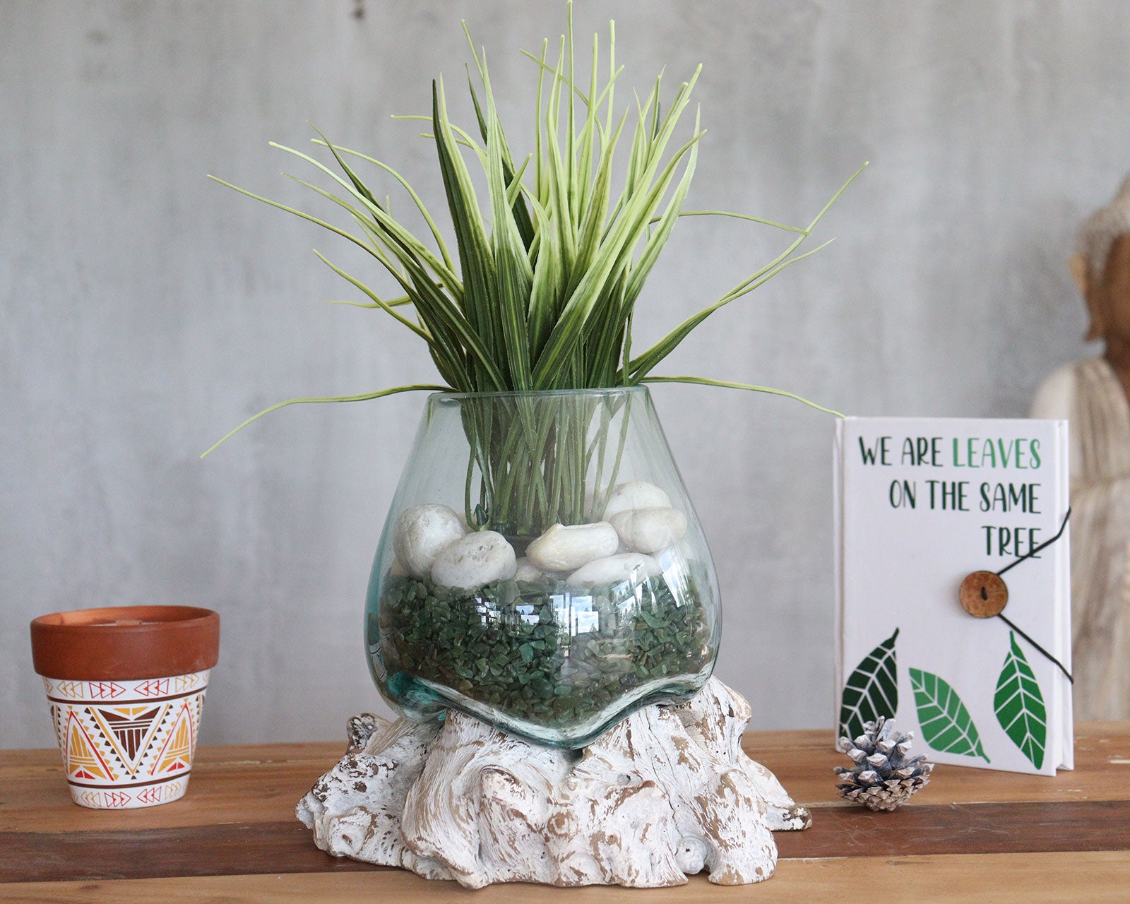 They are crafted by hand in Bali from recycled glass and Balinese Gamal wood. This stunning, molten art glass vase brings the best of two worlds together: natural and man-made; earthy and chic and practical.