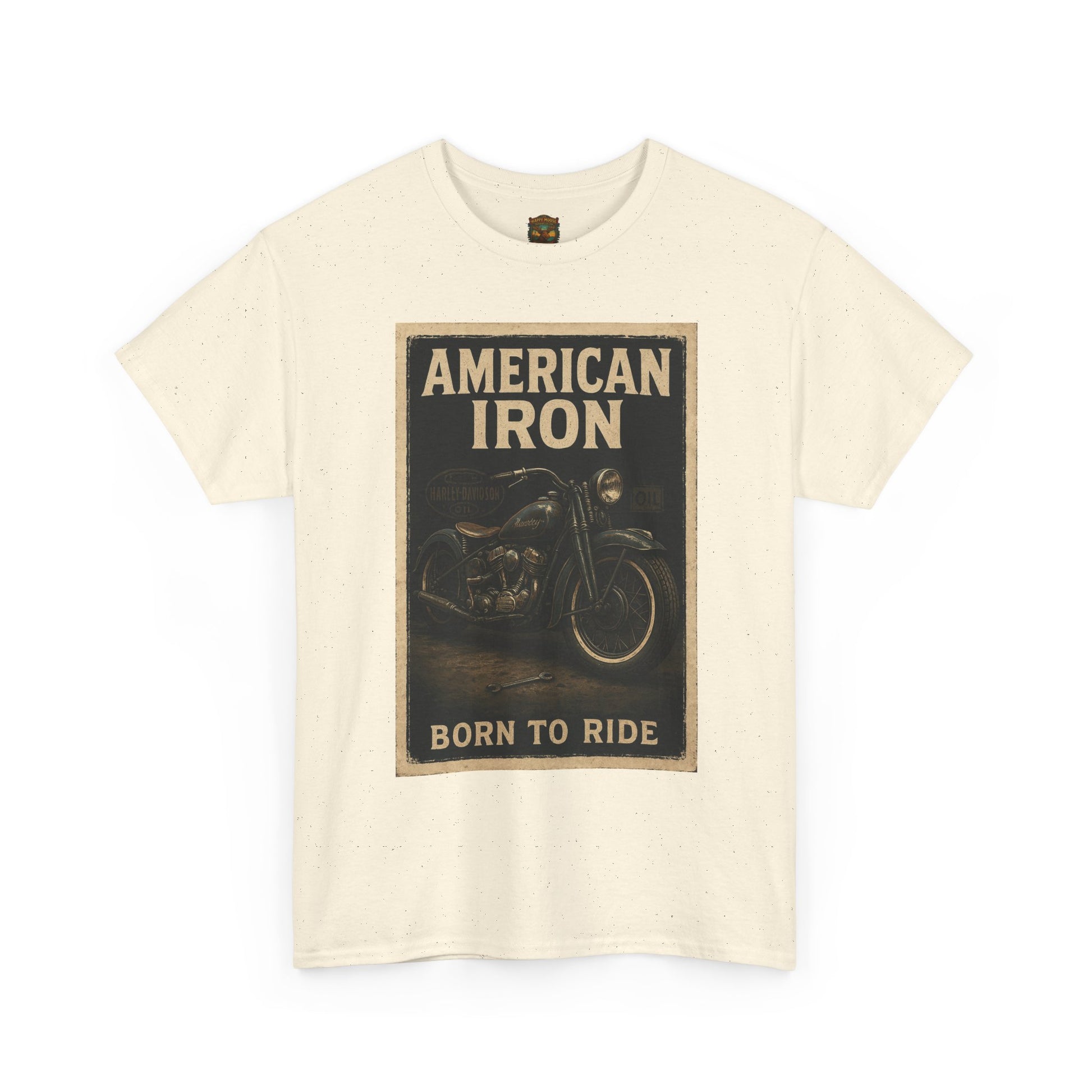 This classic cotton tee carries a vintage motorcycle poster right on the chest — a little road-worn swagger for days when you want to feel the open highway even if you’re just running errands. The muted, distressed print reads “AMERICAN IRON” over a shadowed motorcycle and the line “BORN TO RIDE,” giving the shirt an authentic, lived-in look that pairs naturally with worn denim, a leather jacket, or a favorite flannel. It settles comfortably on the shoulders and breathes well, so it’s the kind of top you reach for when you want to channel a slow Sunday ride, swap stories at the local bike meet, or layer up for a fall bonfire. Lightweight but durable. Clean, crew-neck silhouette that keeps the focus on the art. Feels familiar from the first wear; ages gracefully with time and wash. Product features - Twill shoulder tape stabilizes seams and prevents stretching - Tubular knit (no side seams) for a smooth, waste-reducing finish - Elastic ribbed collar retains shape wash after wash - Medium-weight 100% cotton fabric (180 g/m²) — strong, smooth surface ideal for crisp prints - Tear-away label and Oeko-Tex certified materials for comfortable, safe wear Care instructions - Non-chlorine: bleach as needed - Do not iron - Do not dryclean - Machine wash: cold (max 30C or 90F) - Tumble dry: low heat