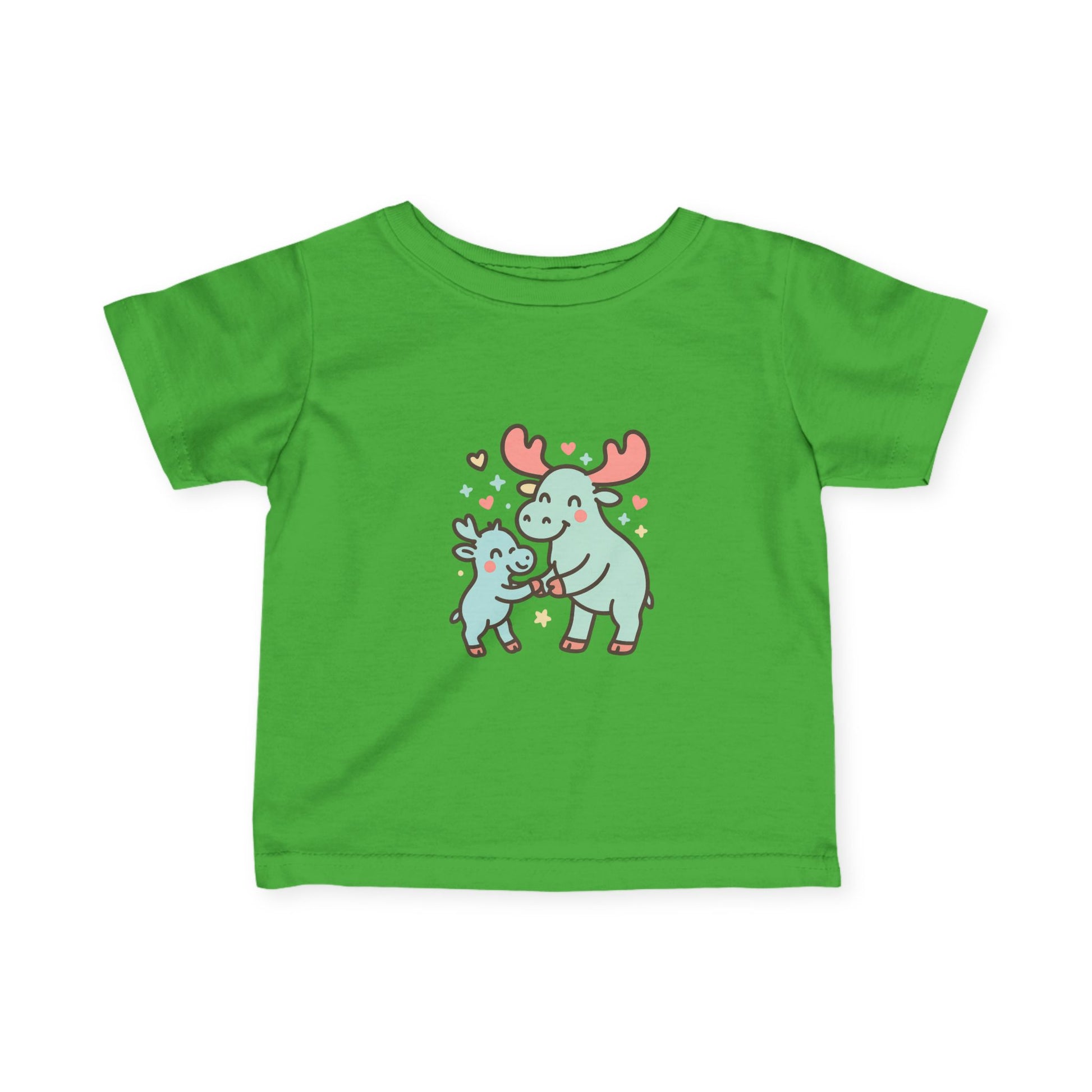 Soft, playful, and made for tiny adventures—this infant tee brings a gentle moment to everyday dressing. The cuddly moose illustration—two mint-green moose exchanging a hug surrounded by tiny hearts—feels like a quiet storybook scene stitched onto a light, breathable shirt. The fabric drapes softly against delicate skin and the ribbed collar and shoulder tape keep the neckline steady through washes and wiggles. It sits with a classic, relaxed shape that layers easily under sweaters or pairs with little leggings for park outings, family photos, or cozy afternoons at home. The overall vibe is warm and tender: a small piece that helps parents celebrate ordinary, loving moments with their child.