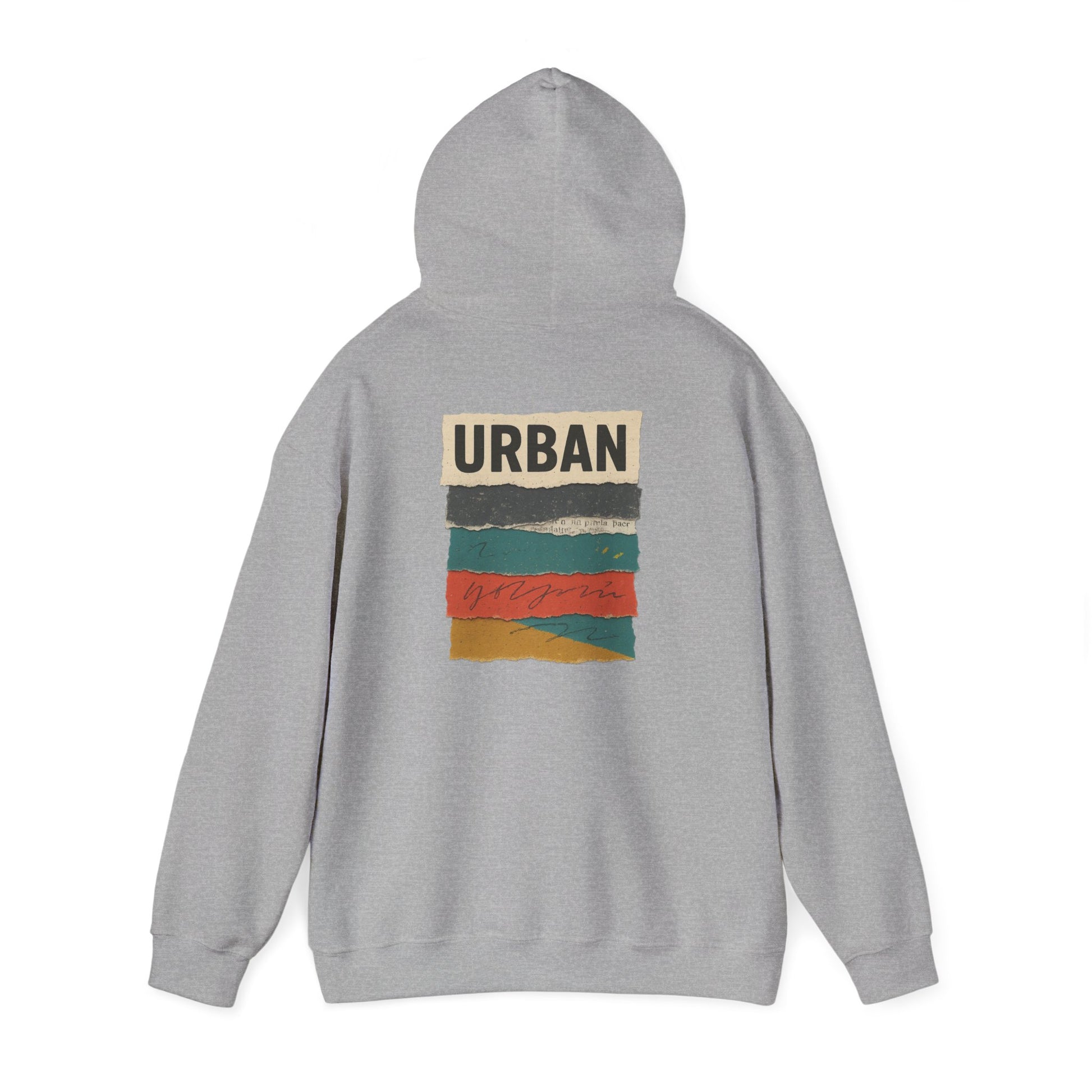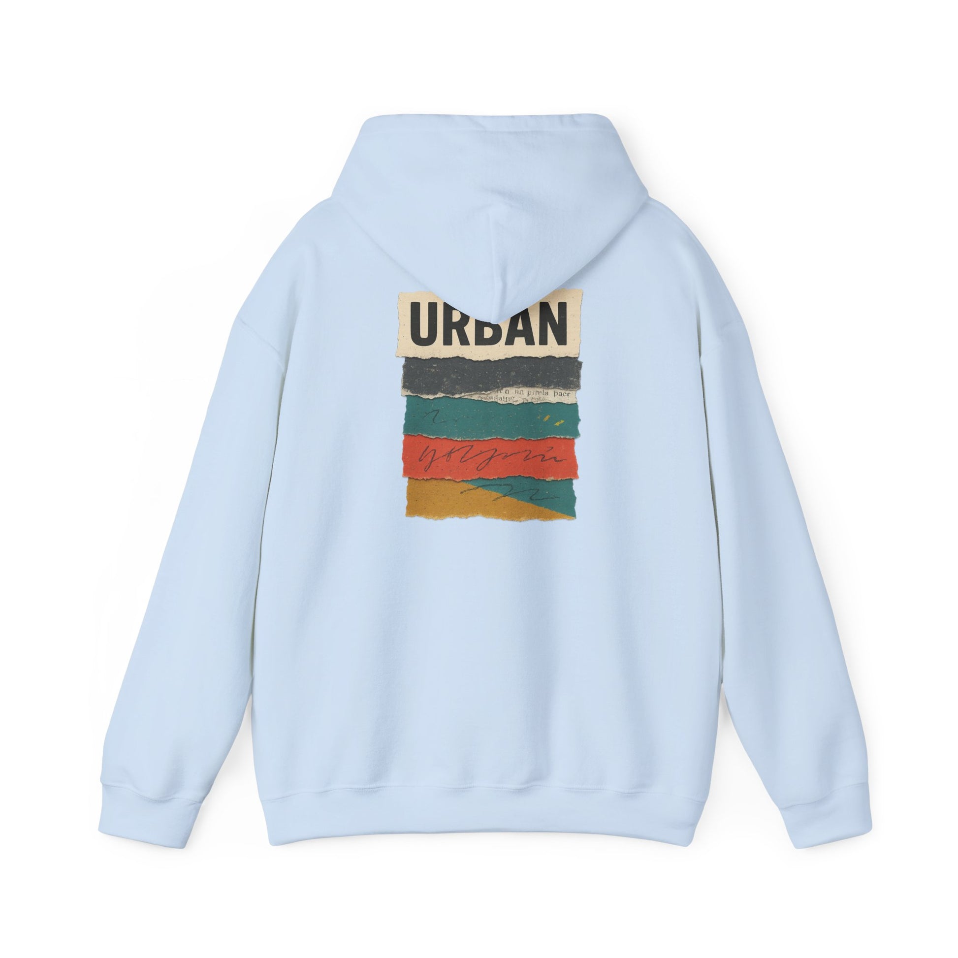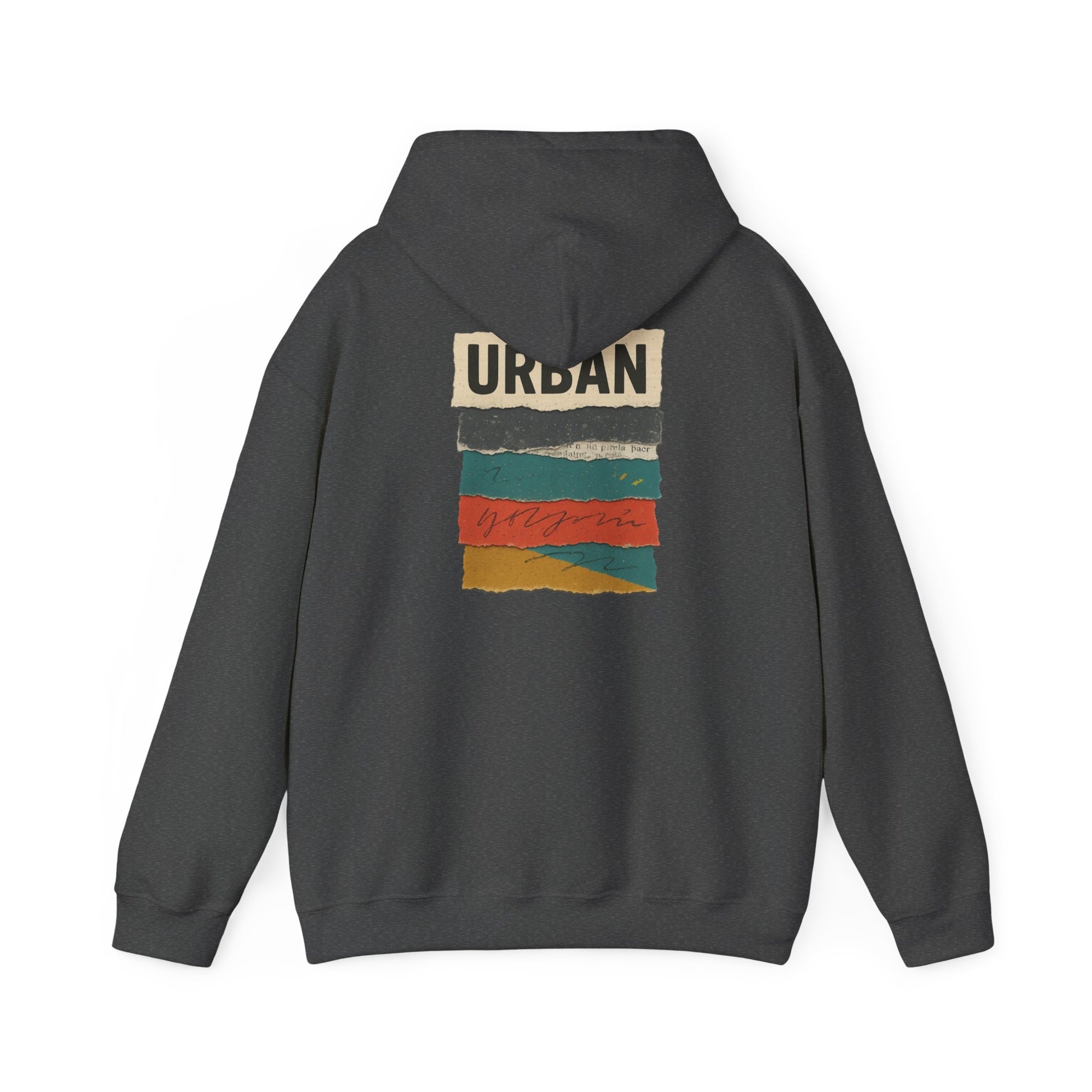 This cozy hoodie brings a calm, city-edge vibe to everyday wear. Soft, midweight fleece and a roomy kangaroo pocket make it a go-to for chilly commutes and slow weekend mornings. The back features a layered, torn-paper graphic in warm earth tones with a bold "URBAN" heading — it reads like a well-worn festival poster or a street-collage found on an alley wall. It settles easily into an urban explorer’s rotation: thrown over a tee for coffee runs, layered under a coat on windy nights, or worn on creative days in the studio. Thoughtful details — color-matched drawcord, double-lined hood, and tear-away label — keep the focus on comfort and lived-in style.