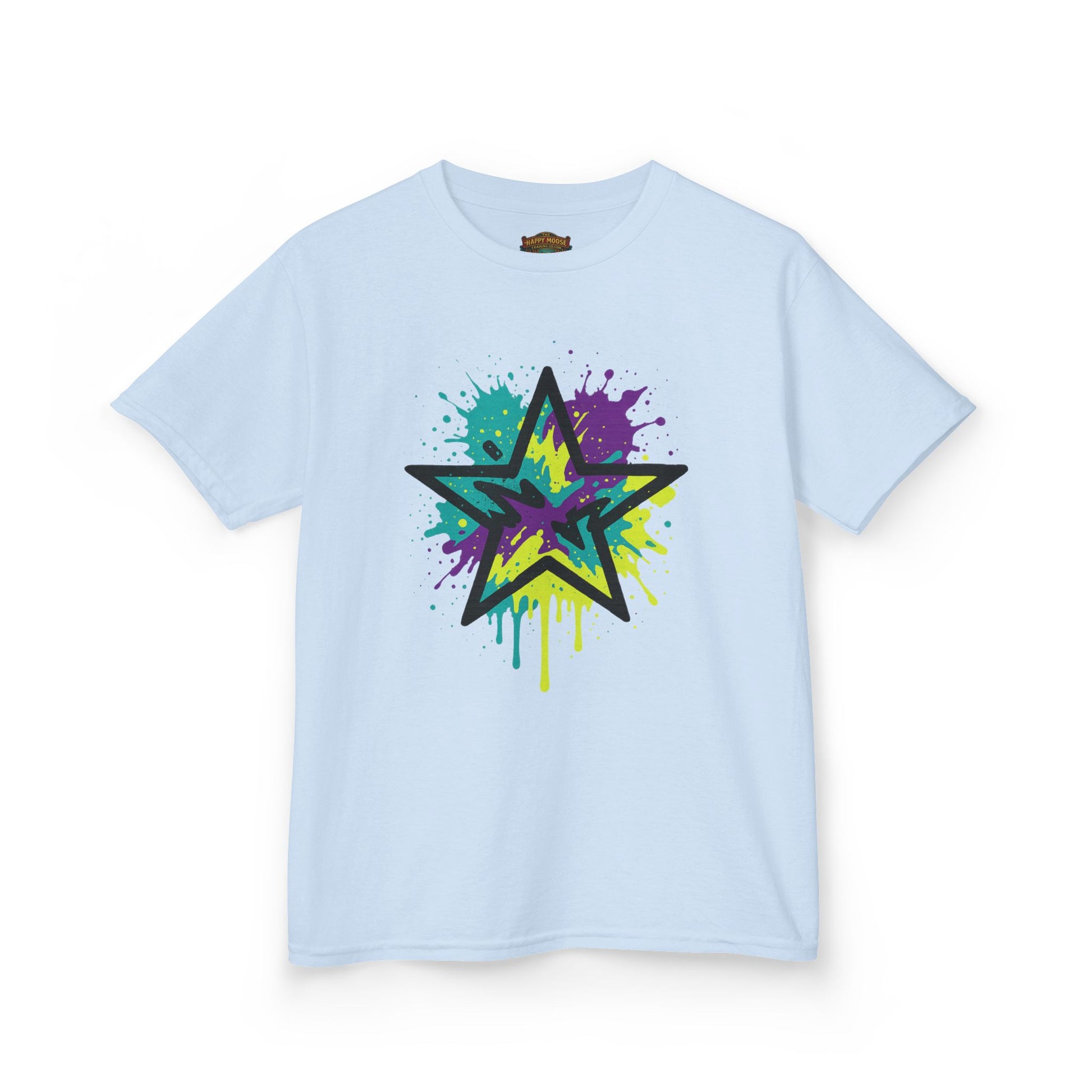 A bright, energetic kids' tee that brings playground attitude into everyday wear. The bold, layered star graphic feels like a spray-painted mural—splashes of teal, purple and neon chartreuse with dripping paint accents that read loud and playful. Lightweight but sturdy cotton holds the print crisp through running, climbing and repeated washes. Comfortable crew neckline and a classic cut let this tee move with kids, while tear-away labels keep it scratch-free. It's the kind of shirt that becomes a favorite for active days, art projects, and casual hangouts with friends.