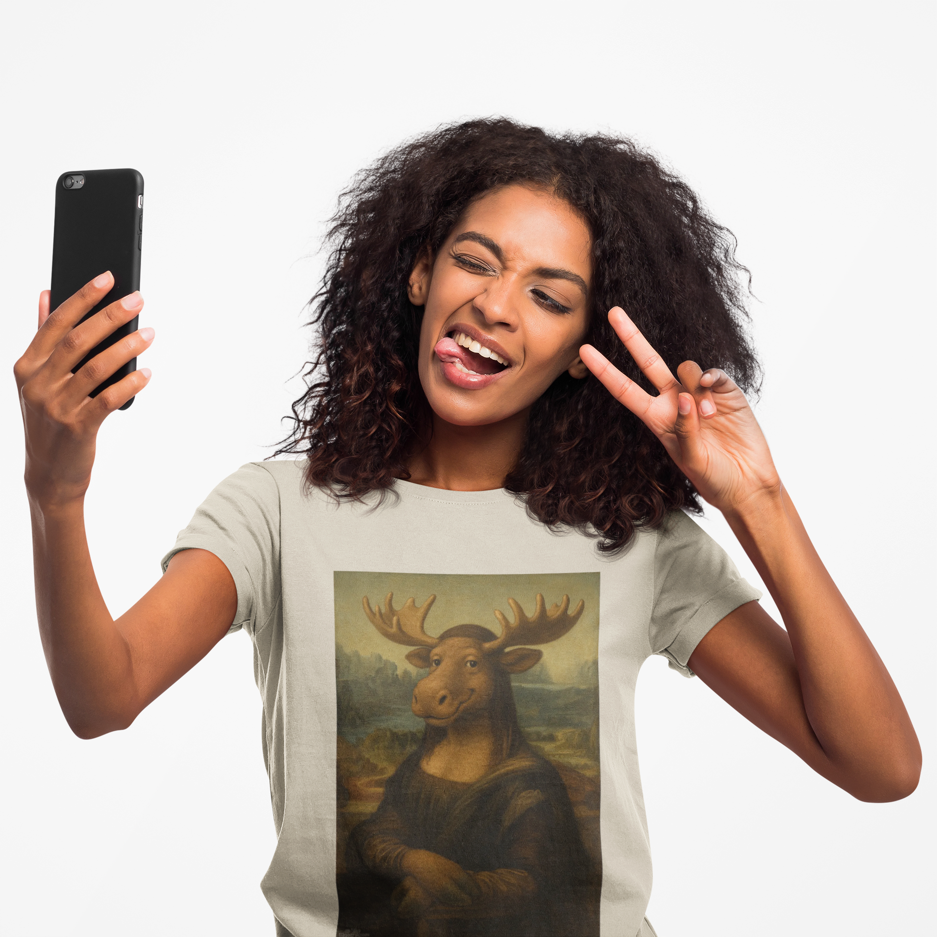 A soft, classic tee printed with a whimsical, artful mashup: a Mona Lisa–style portrait reimagined with a moose head. The image sits centered on a clean white canvas, its warm, painterly tones bringing subtle contrast against everyday wear. This shirt feels lived-in and easy—a quiet conversation starter for gallery nights, cabin trips, or relaxed weekends. It layers under jackets or stands alone with jeans; the breathable cotton keeps it comfortable from morning coffee runs to late-night storytelling by the fire.