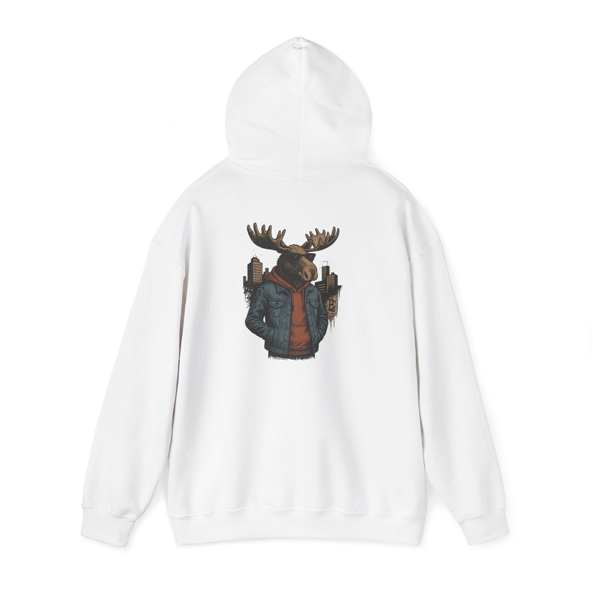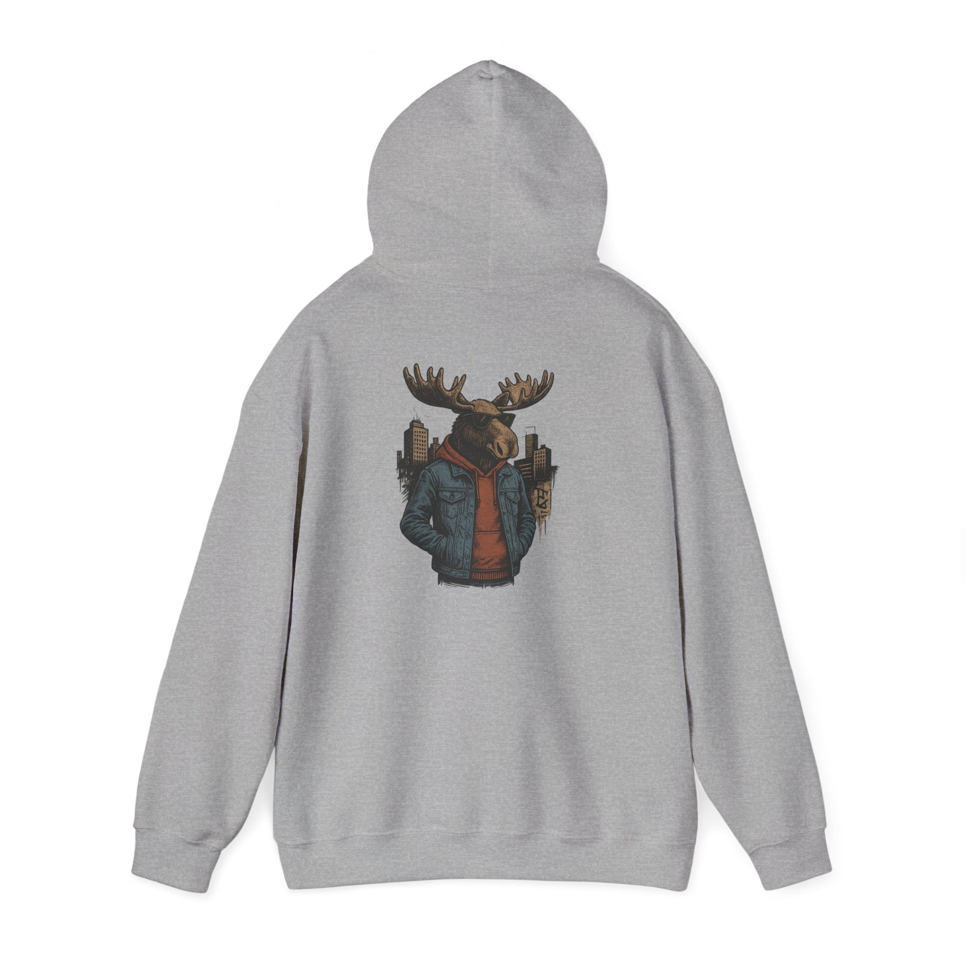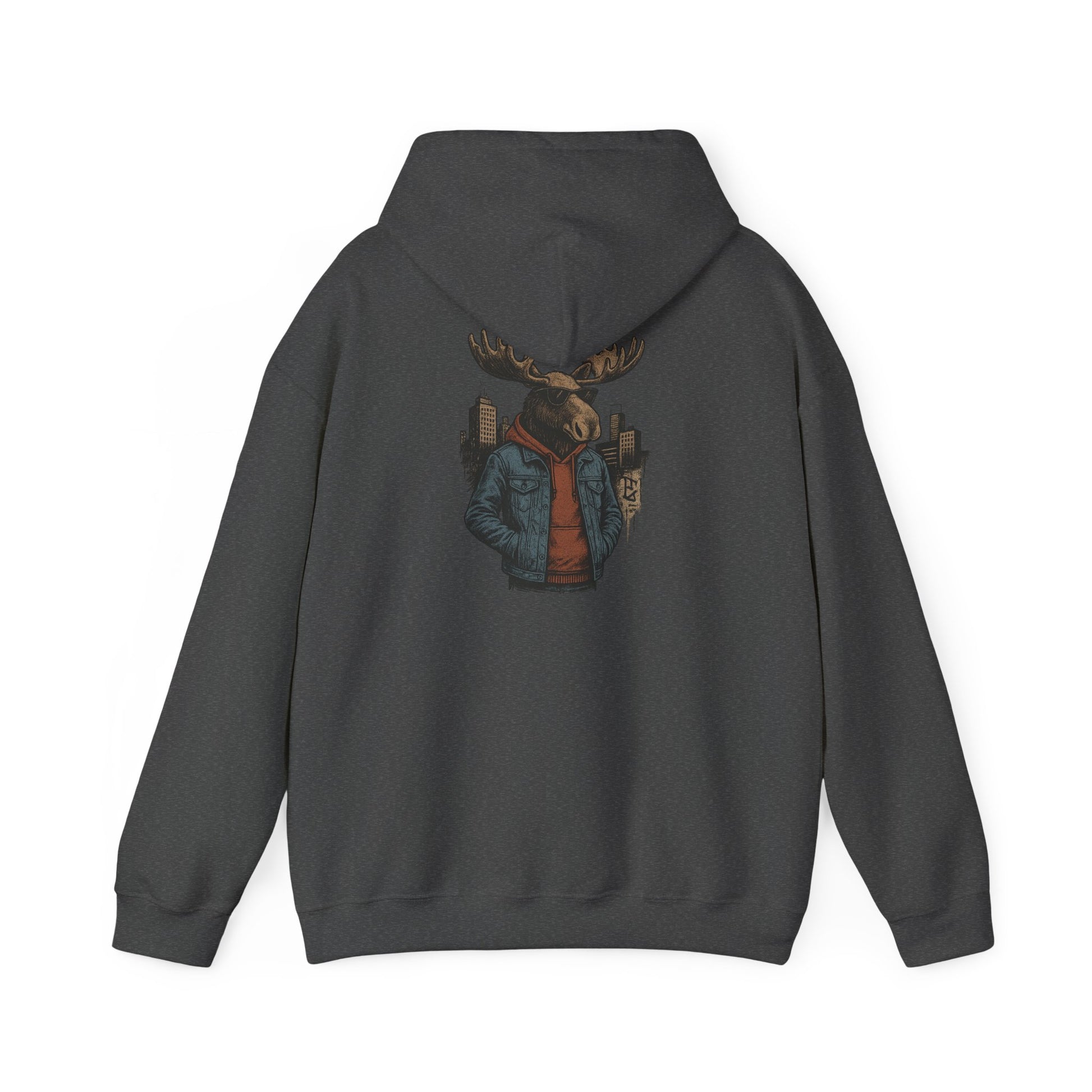 This hoodie carries a quiet, cozy confidence—soft and substantial, it wraps you in warmth while showcasing a striking back print: a moose in streetwear, city skyline tucked behind its antlers. The thick 50/50 fabric and double-lined hood feel substantial on cooler mornings; the kangaroo pocket keeps hands toasty and provides casual utility. Wear it to late-night campfire hangs, cross-town coffee runs, or layered for a weekend road trip. The muted, illustrative design blends outdoor charm with urban edge, so it slips into the wardrobe of someone who loves wilderness motifs but moves through the city with ease.