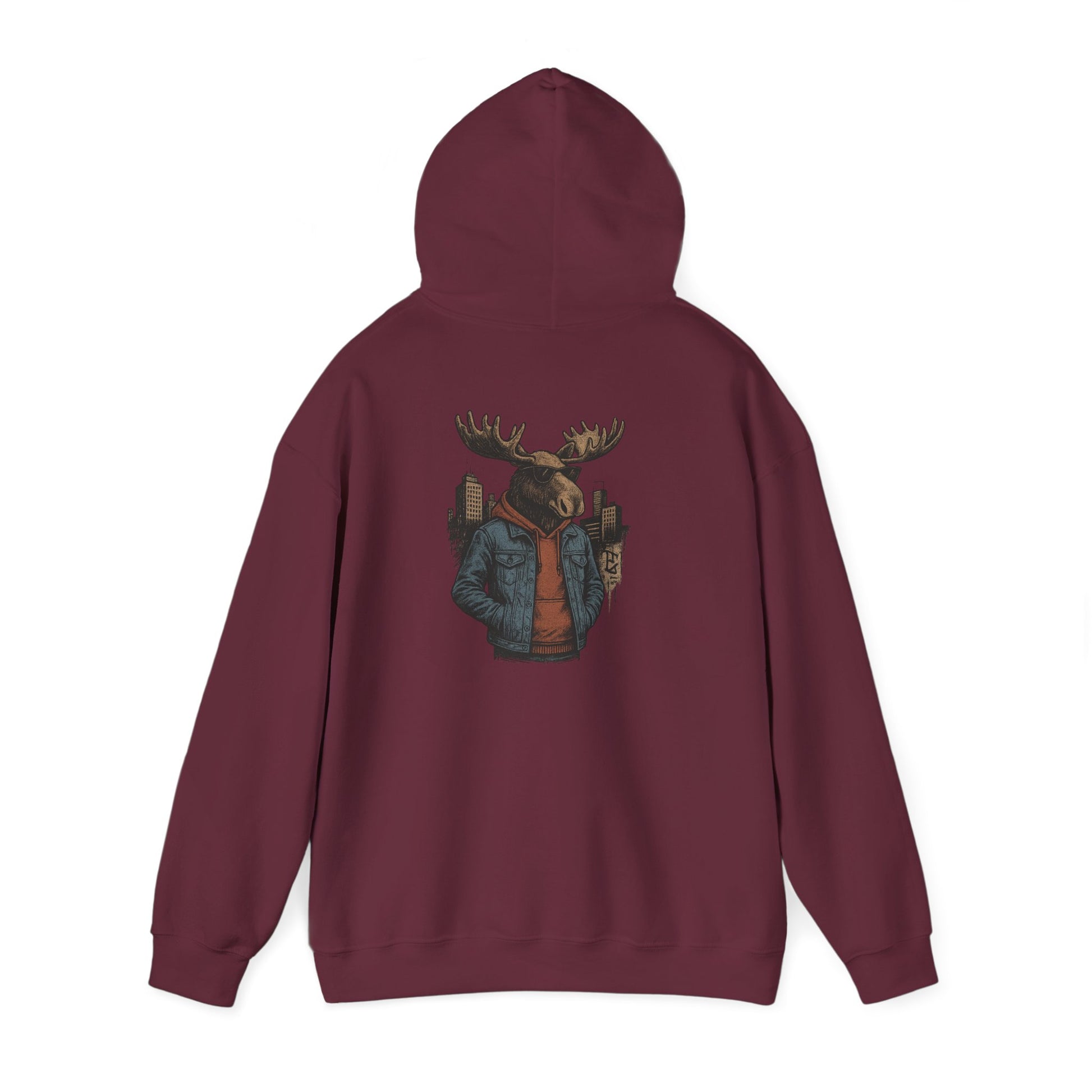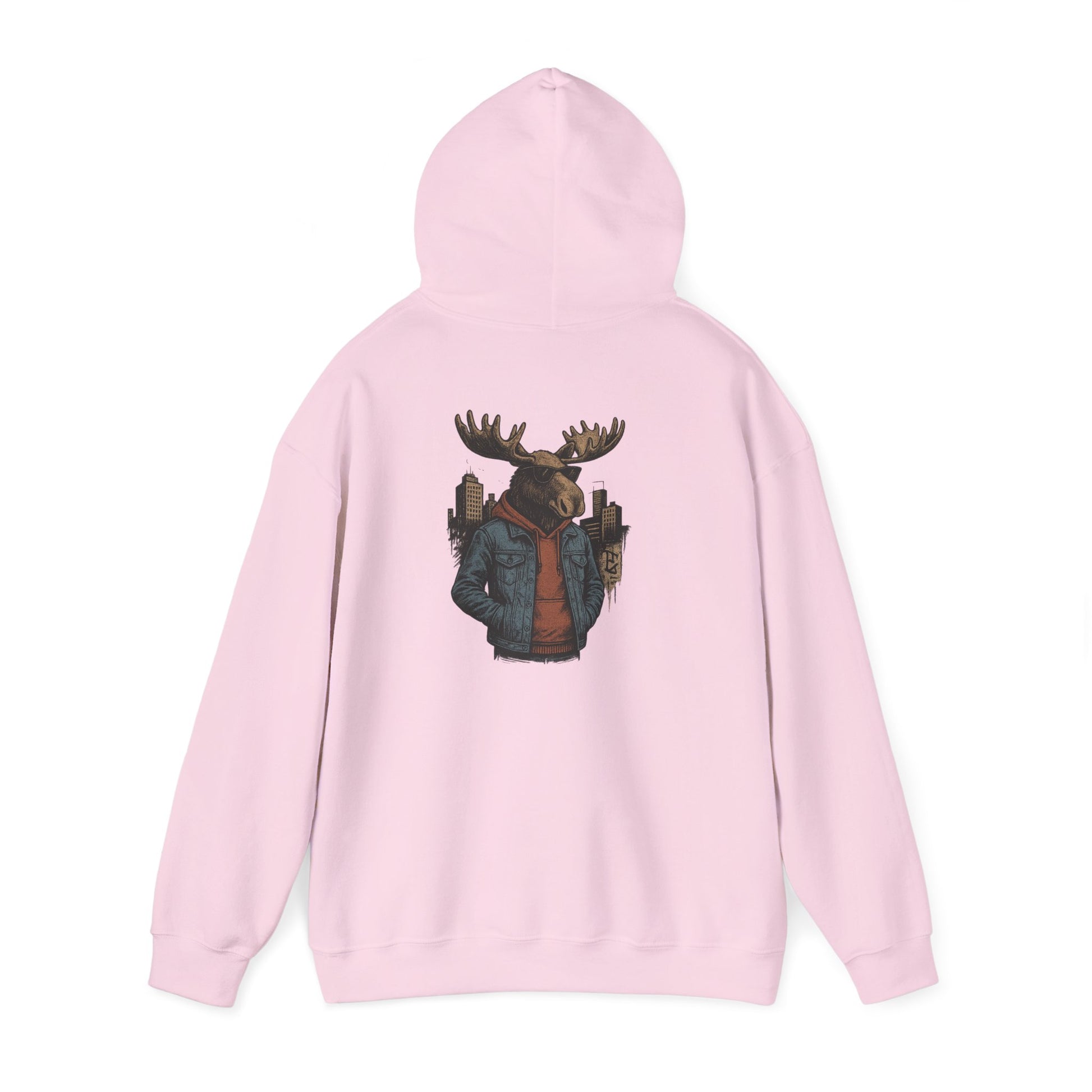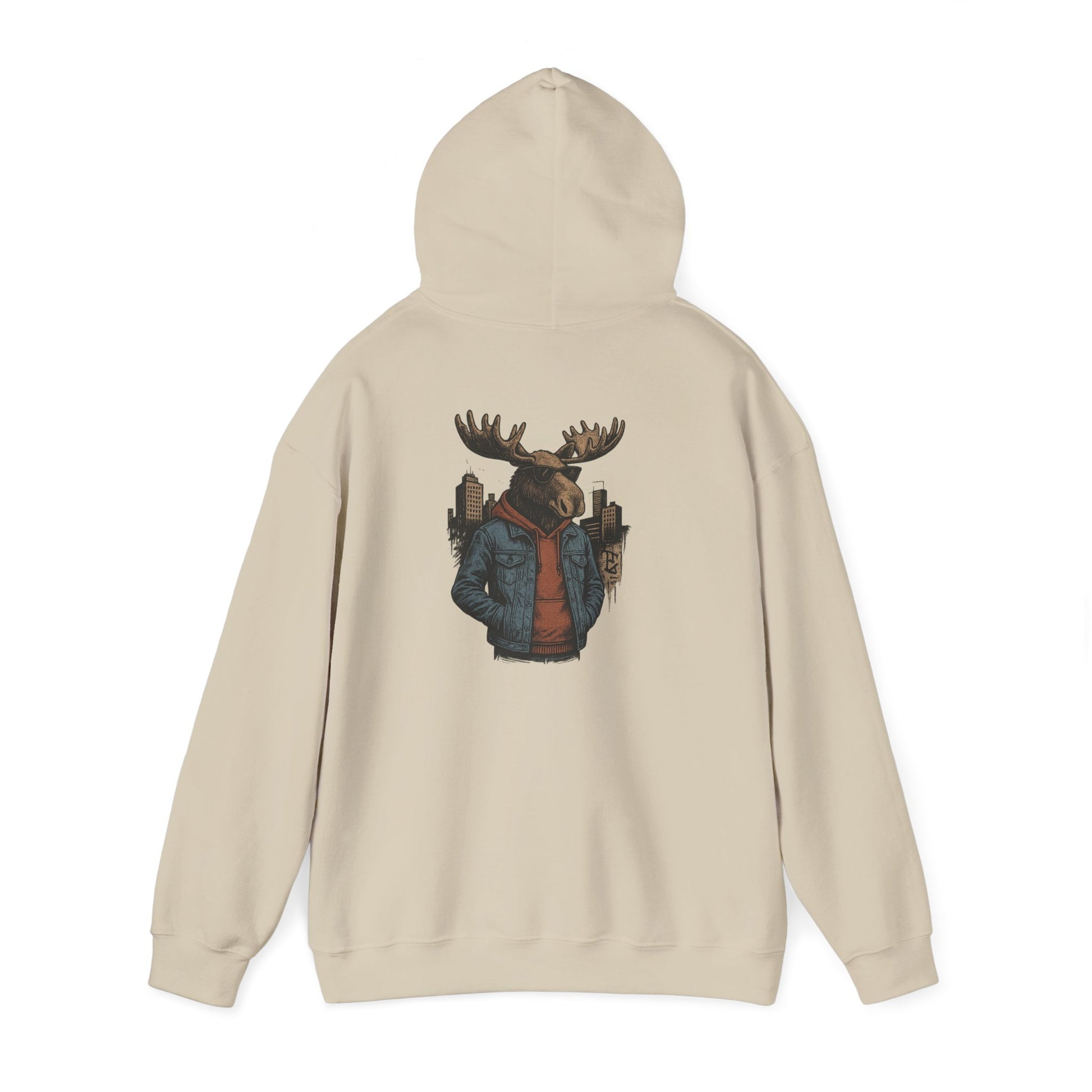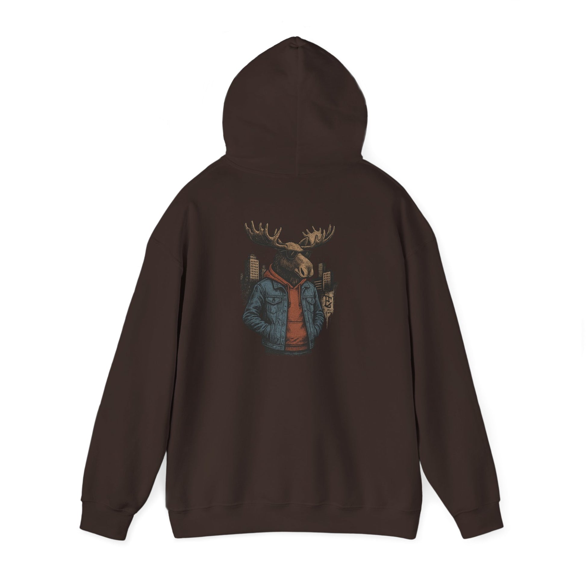 This hoodie carries a quiet, cozy confidence—soft and substantial, it wraps you in warmth while showcasing a striking back print: a moose in streetwear, city skyline tucked behind its antlers. The thick 50/50 fabric and double-lined hood feel substantial on cooler mornings; the kangaroo pocket keeps hands toasty and provides casual utility. Wear it to late-night campfire hangs, cross-town coffee runs, or layered for a weekend road trip. The muted, illustrative design blends outdoor charm with urban edge, so it slips into the wardrobe of someone who loves wilderness motifs but moves through the city with ease.