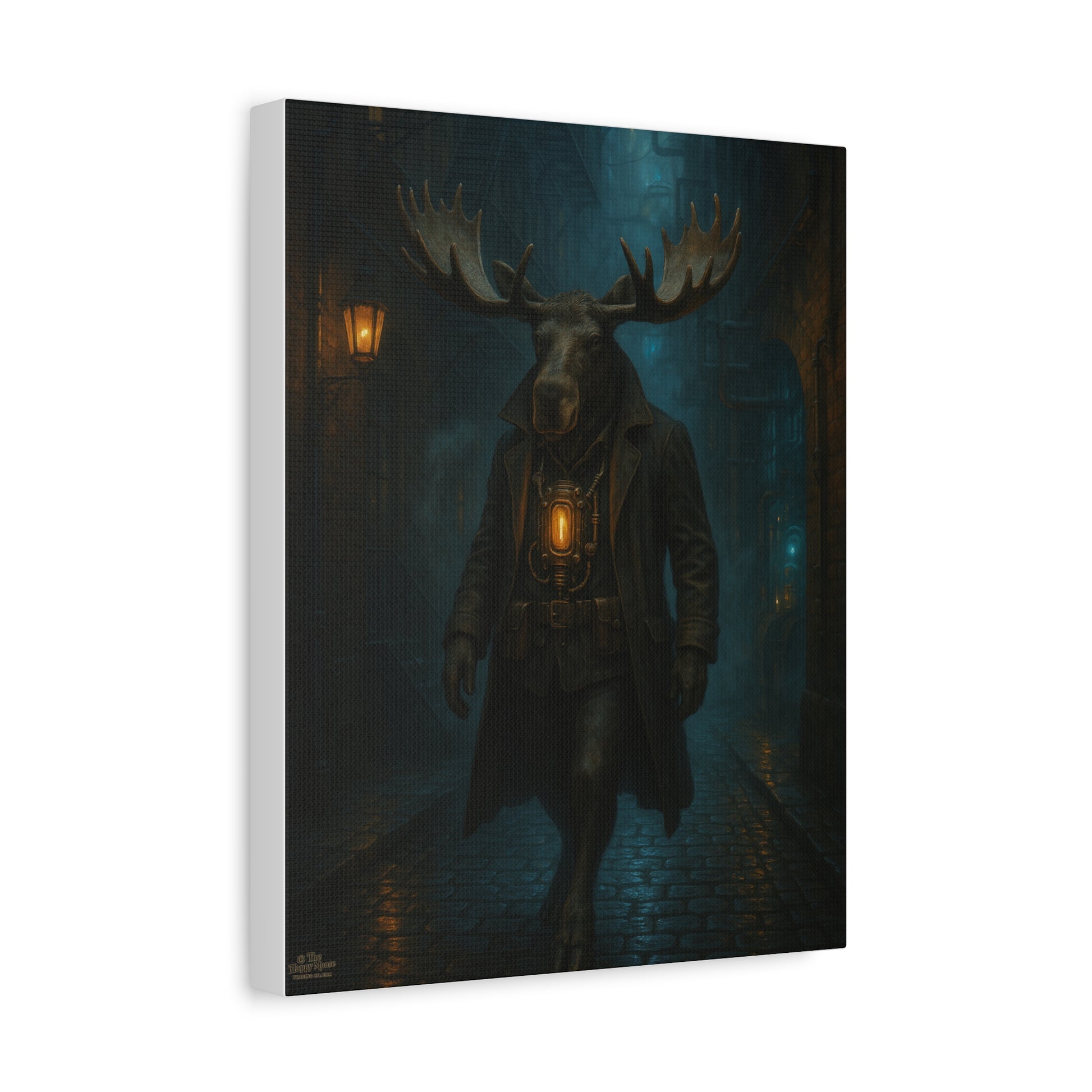 A matte stretched canvas that brings moody, storybook noir to your walls. The image shows a lone, cloaked figure with a moose head, carrying a warm lantern down a wet cobblestone alley. Deep teal and amber tones create a cinematic contrast—soft shadows, subtle texture, and a quiet sense of mystery. Hung in a reading nook, hallway, or study, this canvas feels like the prologue to a midnight tale: tactile cotton-poly canvas, a solid pine profile, and a subdued matte finish that keeps the atmosphere rich without glare. The included back hanging and soft rubber feet make it easy to mount and protect surfaces, while the archival, low-VOC inks keep the colors true for years.