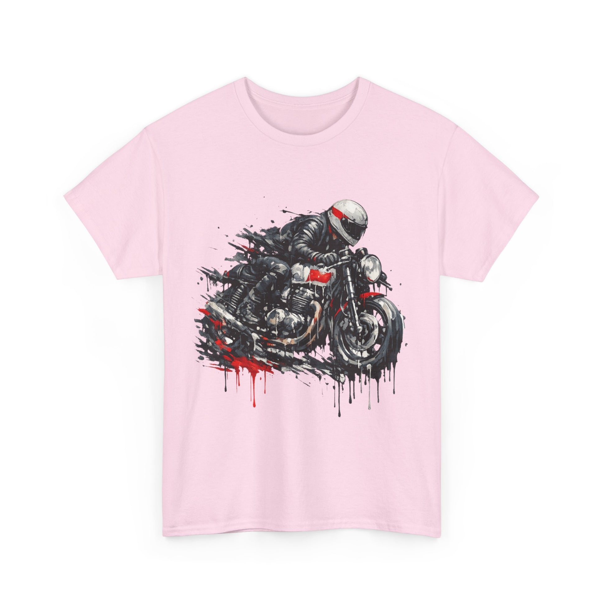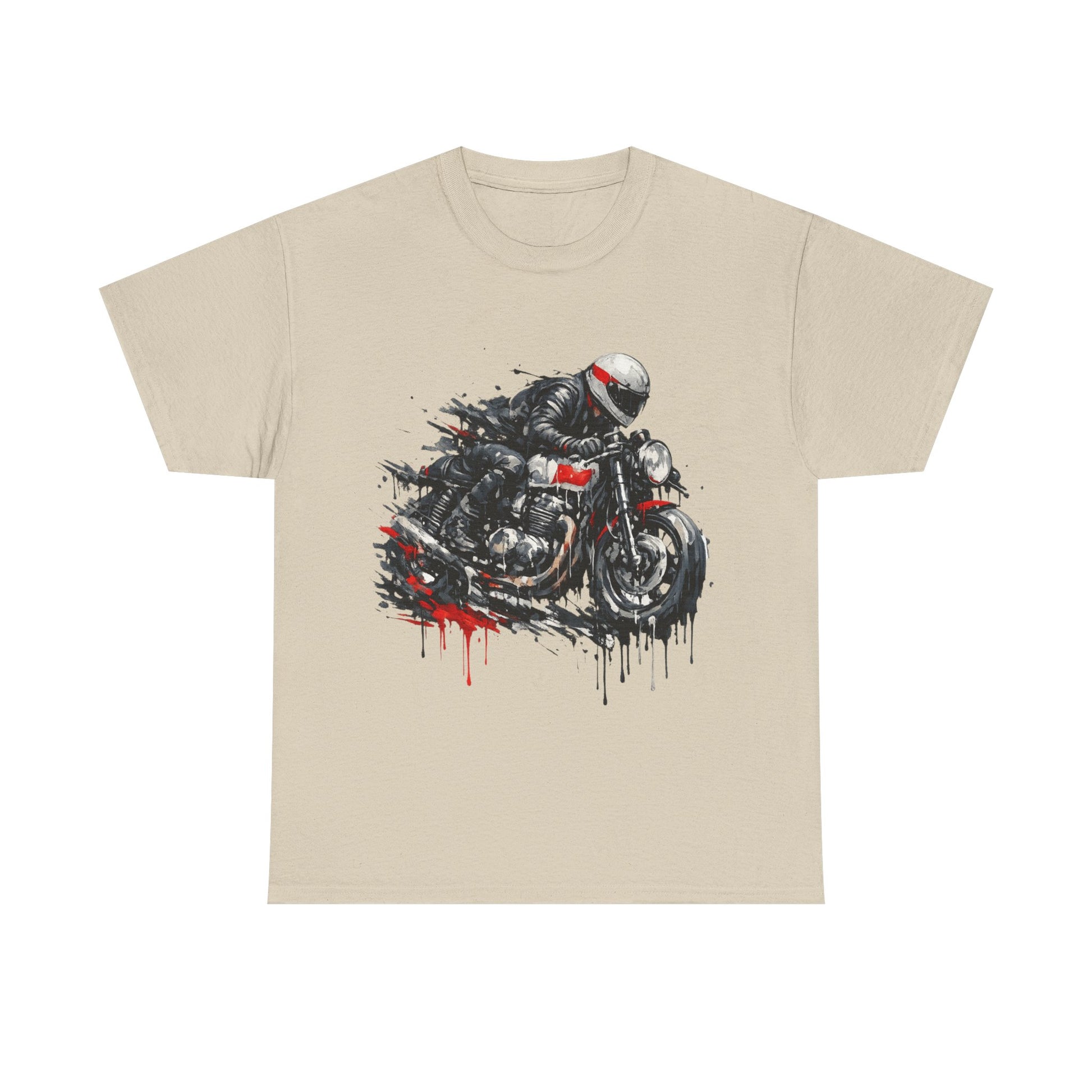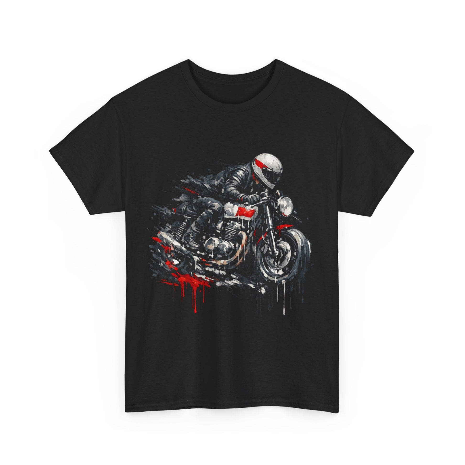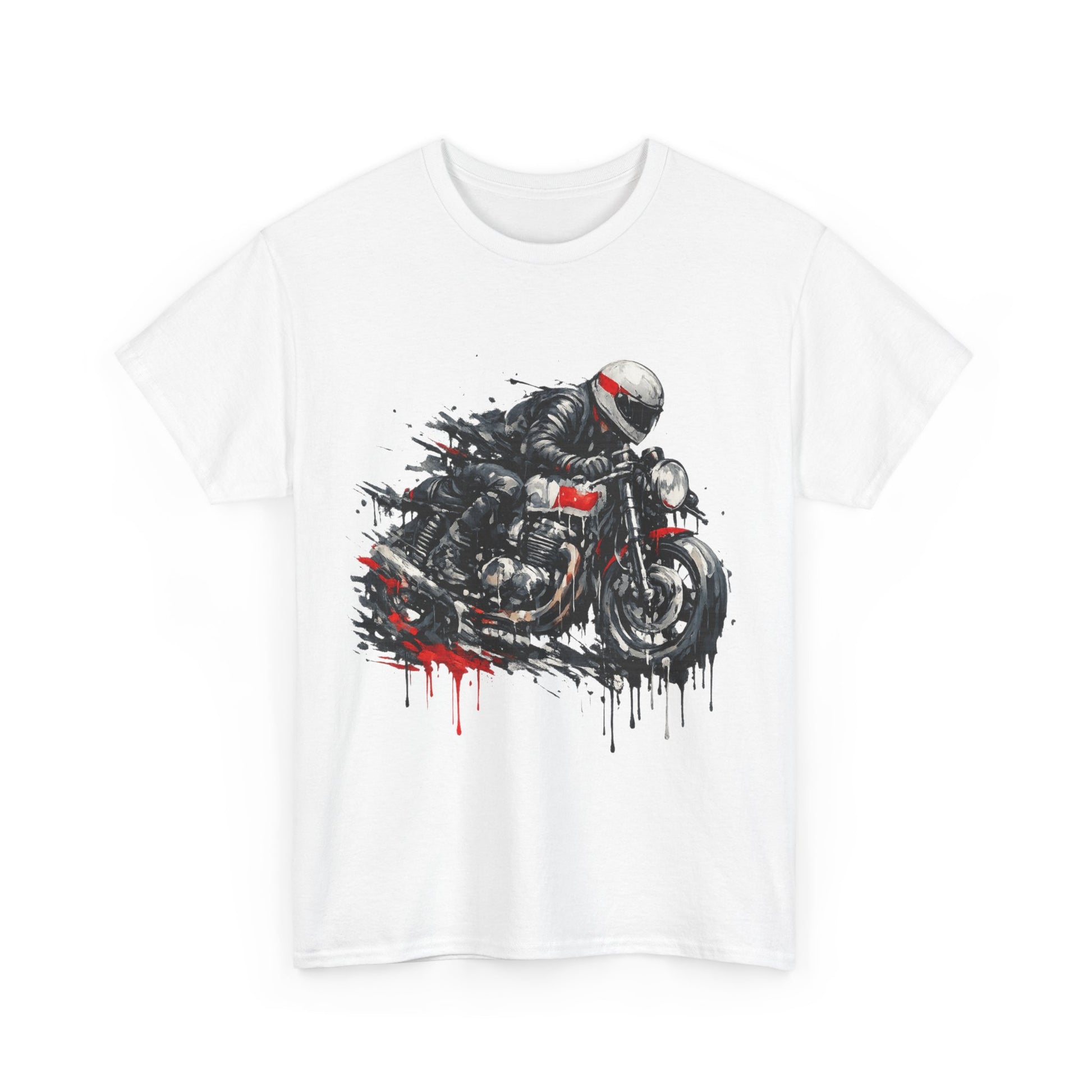 Pure speed and attitude. This striking motorcycle racer t-shirt features an action rider artwork in a gritty paint-splatter / drip style with bold red highlights. Perfect for bikers, café racer fans, petrolheads and anyone who loves racing-inspired streetwear.