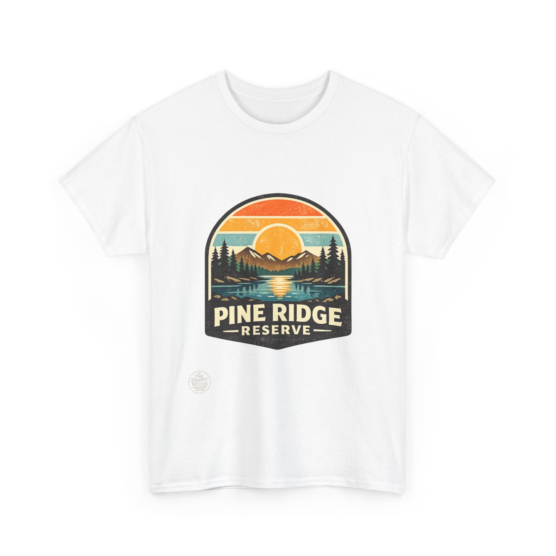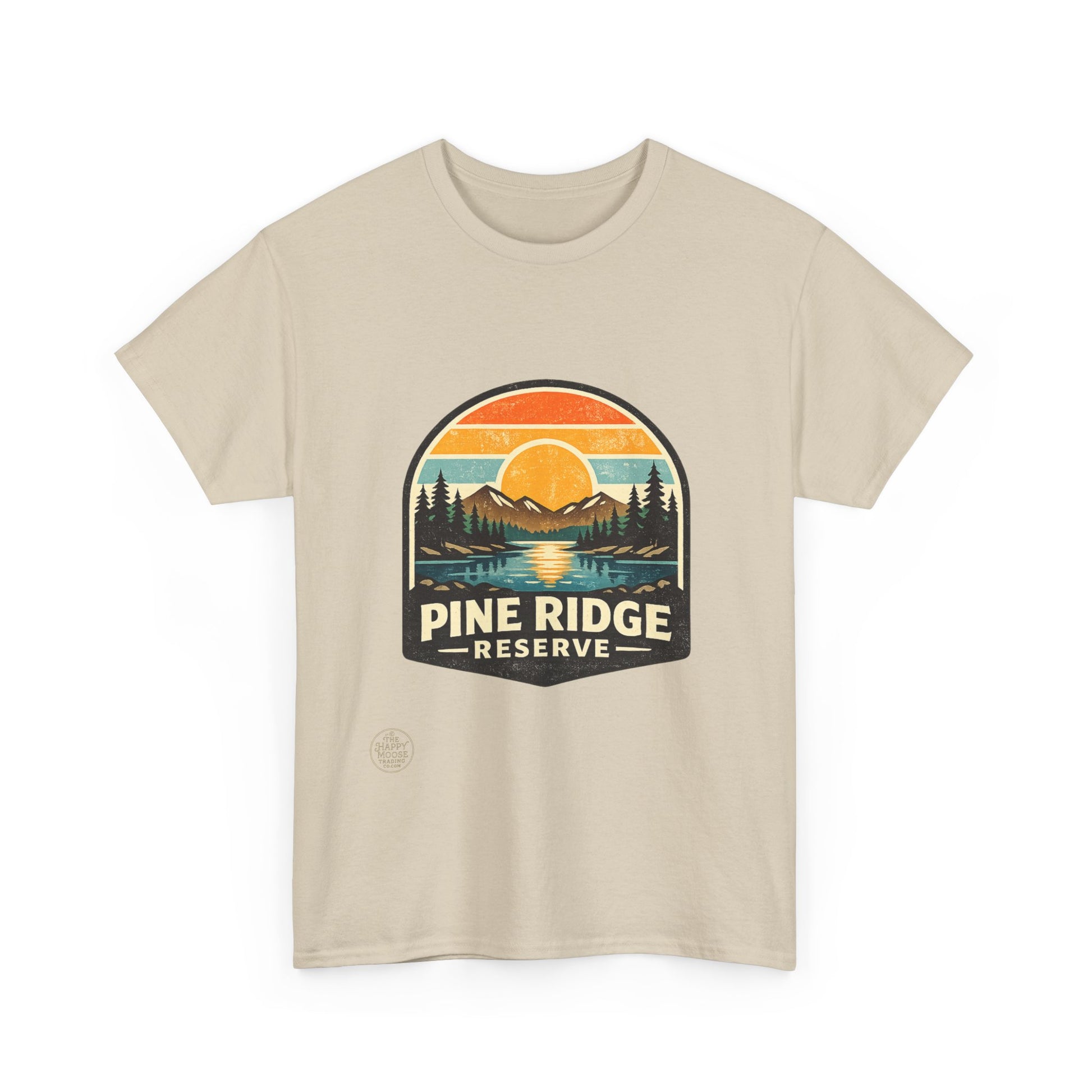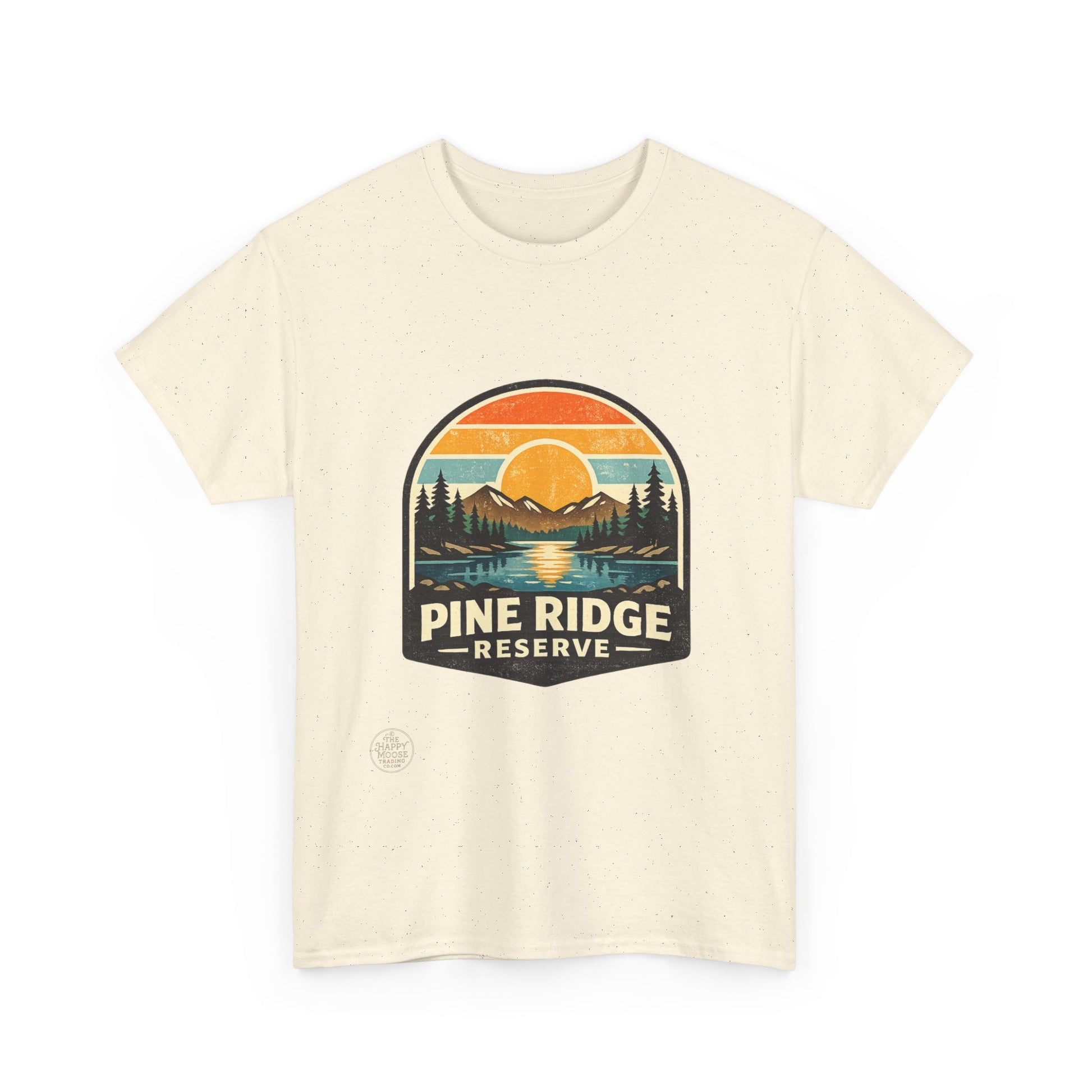 Sunset hues, pine-scented trails, and a quiet ridge where the lake mirrors the sky. This classic tee carries a vintage outdoors badge—muted oranges, forest greens, and deep navy form a cozy scene: a sun dipping behind distant peaks, pines framing a glassy lake, and the words "Pine Ridge Reserve." Wear it on morning coffees before a hike, layered under a flannel for dusk fires, or while running errands when you want that calm, woodsy vibe. The relaxed crew fit and soft, medium-weight cotton make it comfortable all day. It ages into its own—fading gently like old maps of favorite trails—so every wear tells a little story of where you’ve been and where you’ll go next.