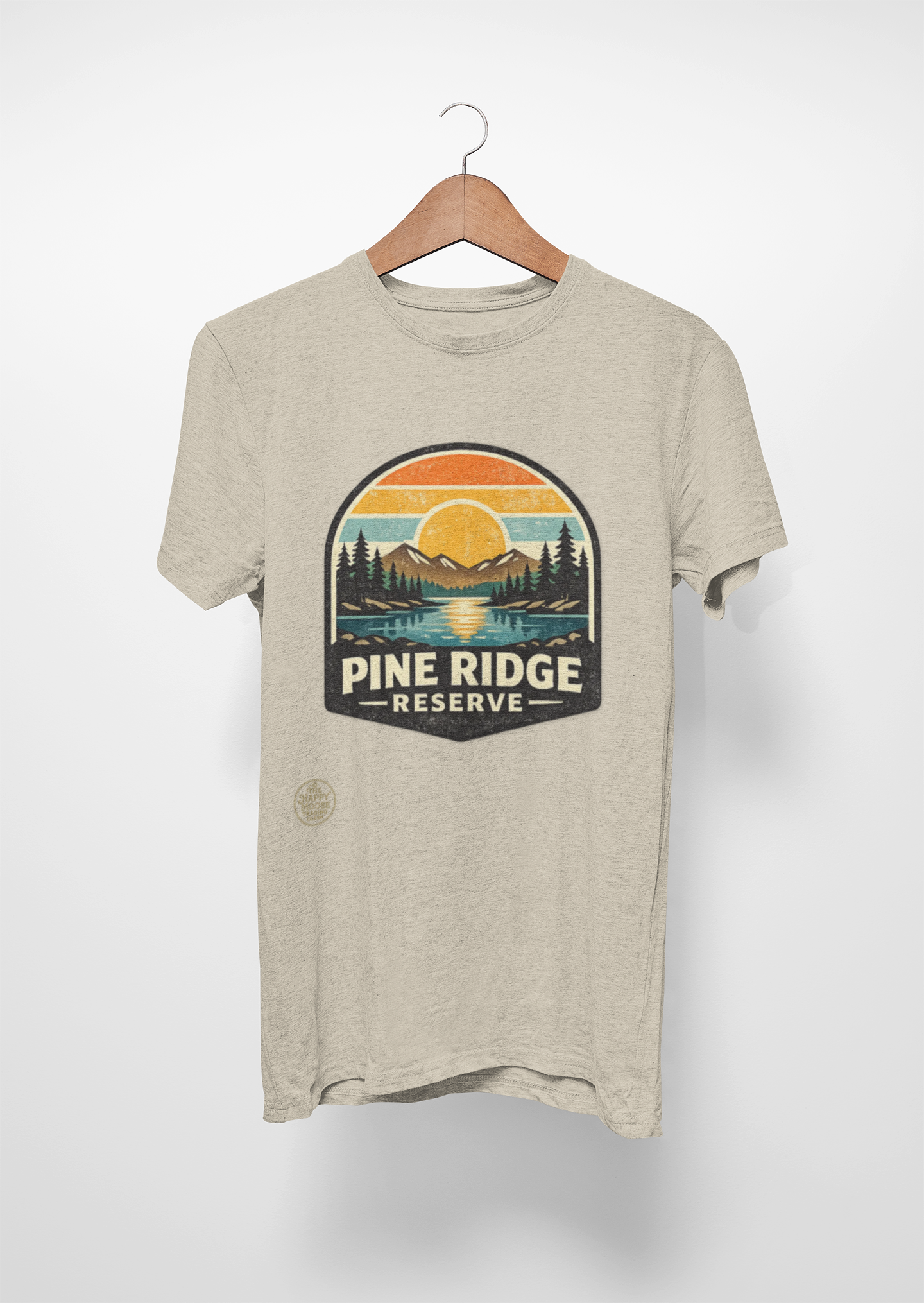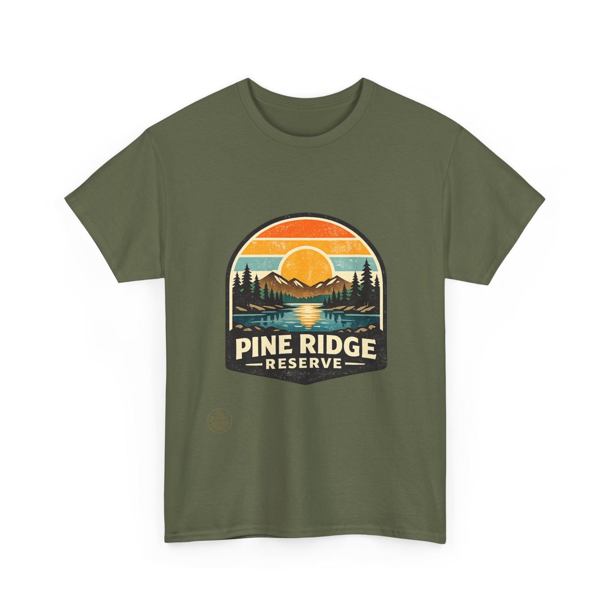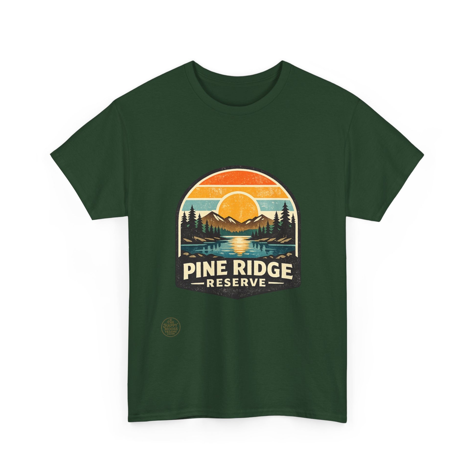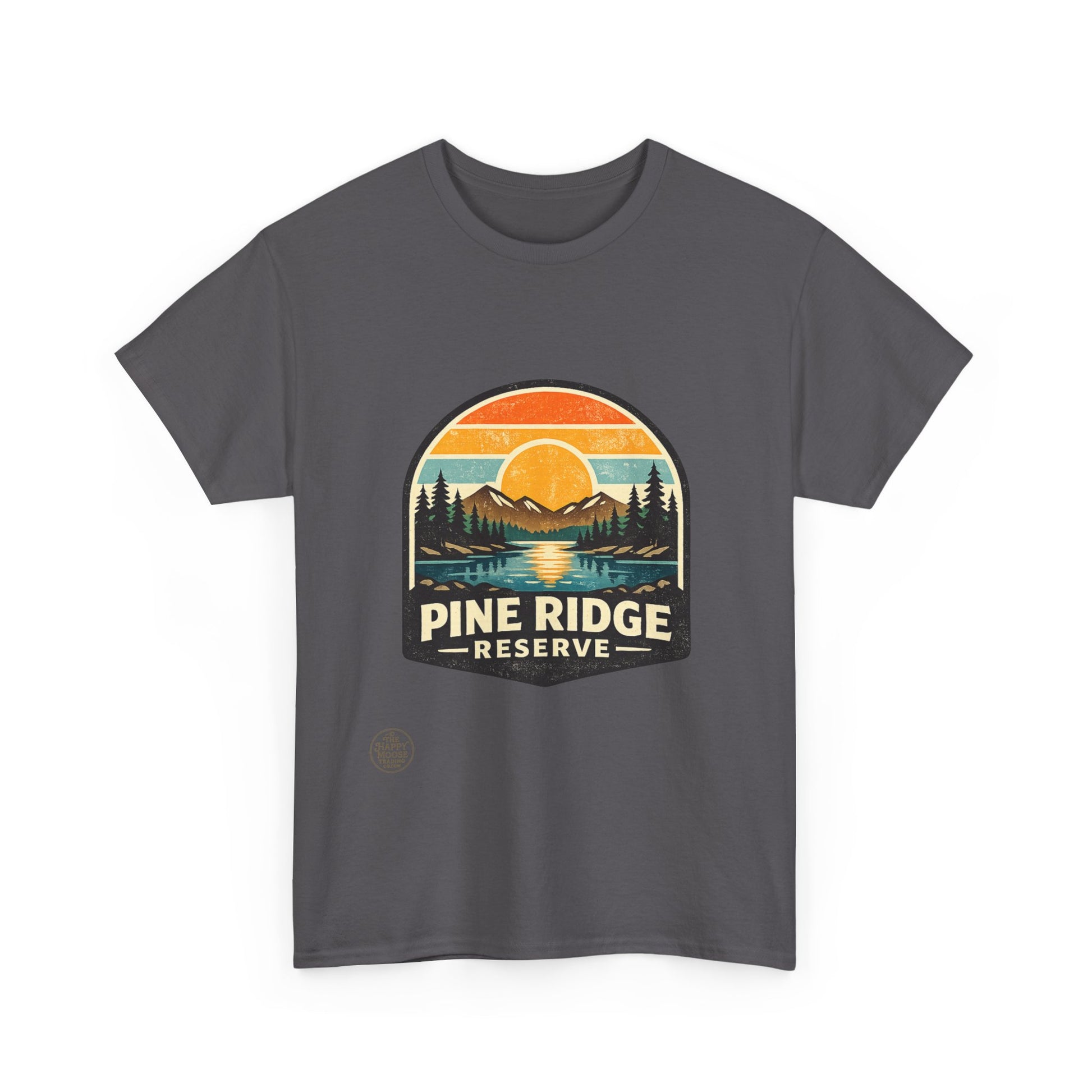 Sunset hues, pine-scented trails, and a quiet ridge where the lake mirrors the sky. This classic tee carries a vintage outdoors badge—muted oranges, forest greens, and deep navy form a cozy scene: a sun dipping behind distant peaks, pines framing a glassy lake, and the words "Pine Ridge Reserve." Wear it on morning coffees before a hike, layered under a flannel for dusk fires, or while running errands when you want that calm, woodsy vibe. The relaxed crew fit and soft, medium-weight cotton make it comfortable all day. It ages into its own—fading gently like old maps of favorite trails—so every wear tells a little story of where you’ve been and where you’ll go next.