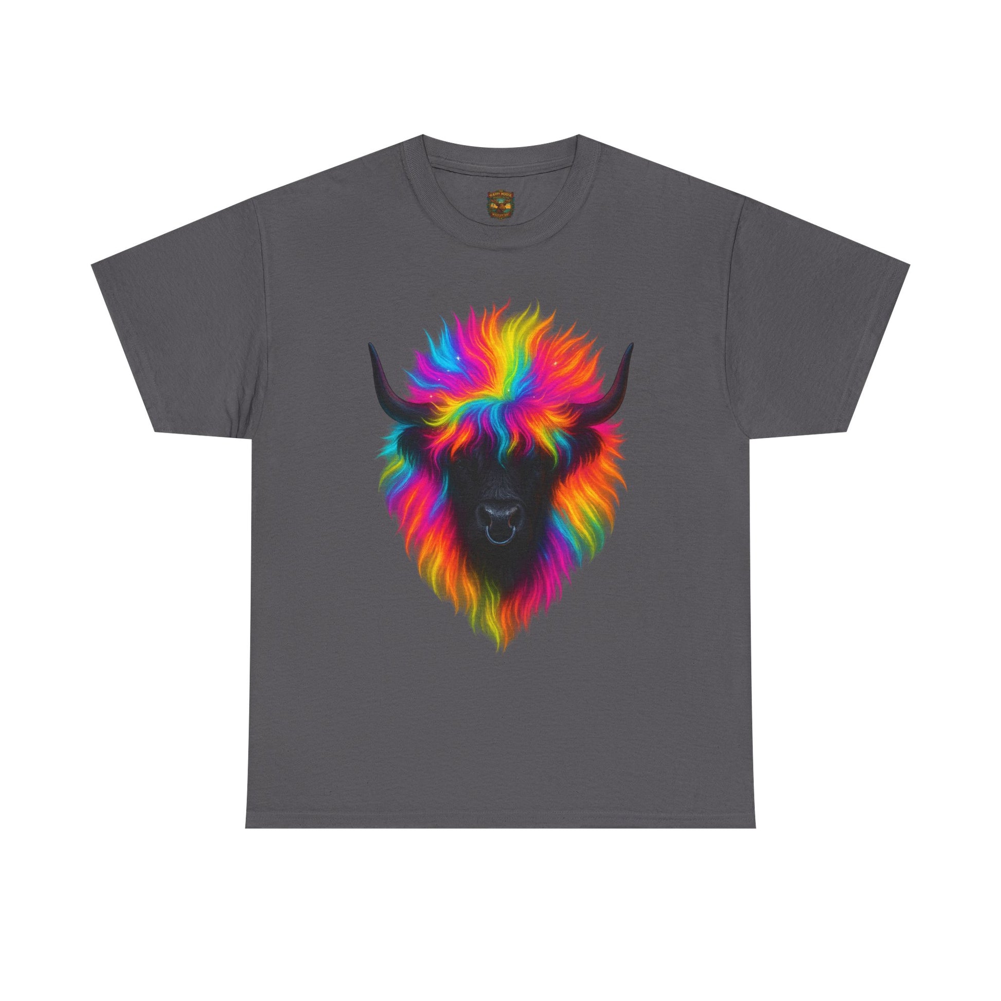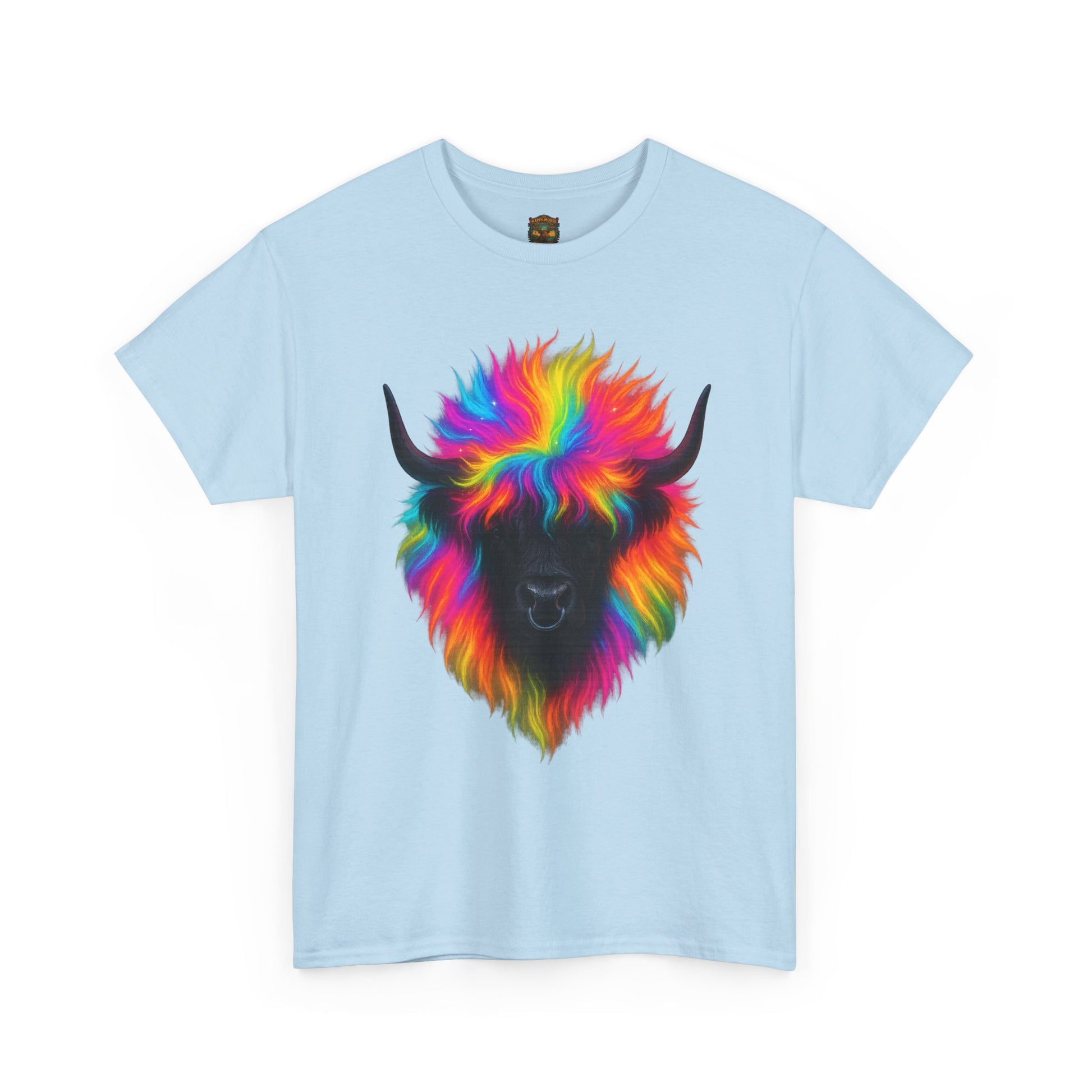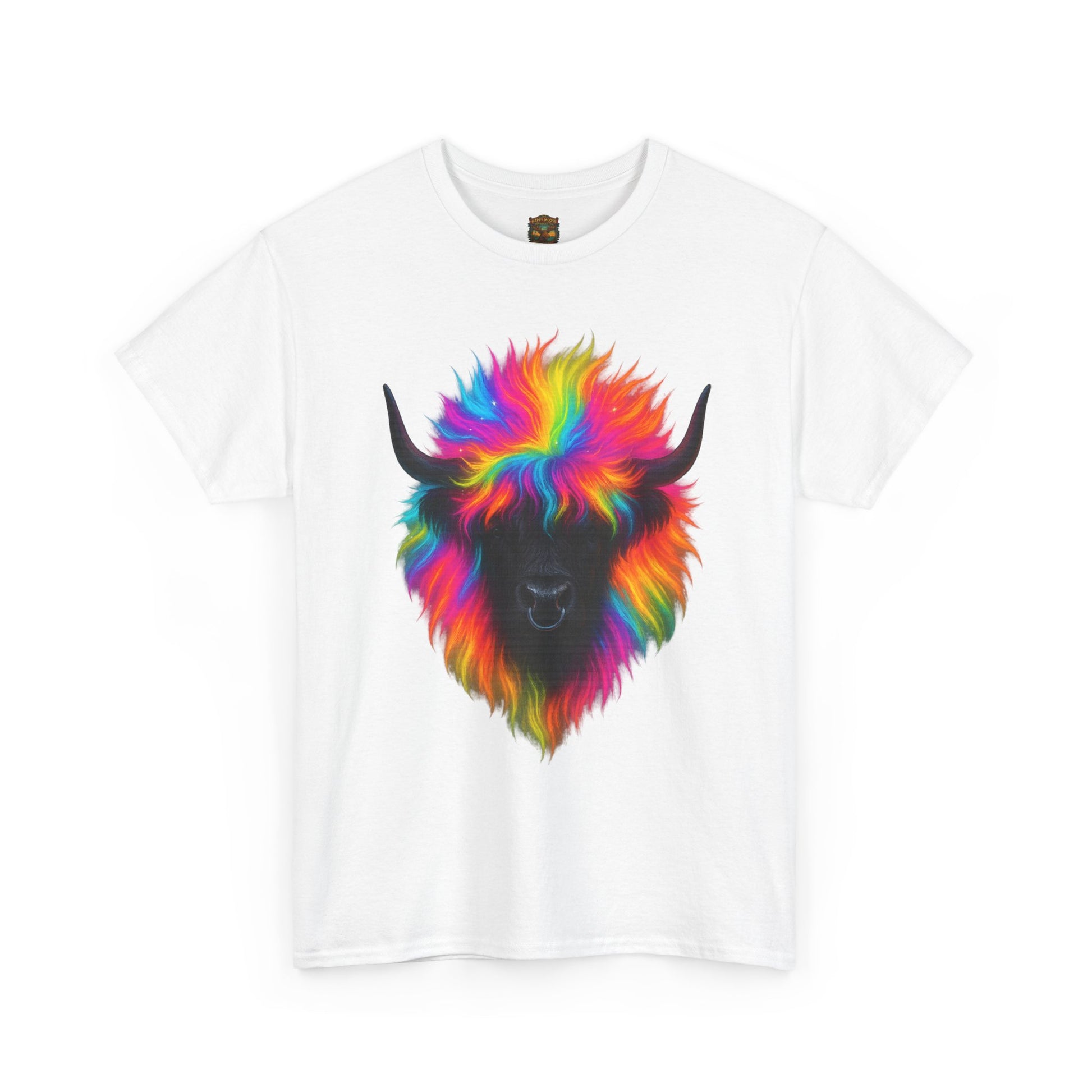 - A soft, breathable tee that wears like your favorite go-to layer and announces personality without shouting. The shirt’s classic crew neck and relaxed fit let the vibrant, rainbow-colored yak motif sit front and center — a playful, artful portrait that feels both whimsical and oddly grounding. Lightweight yet durable cotton holds bright DTG prints with crisp edges, while reinforced shoulder tape and a tear-away label keep the shirt comfortable wash after wash. Throw it on for long drives, gallery days, or relaxed nights around a backyard fire; the shirt reads like a small celebration of color and calm in equal measure.