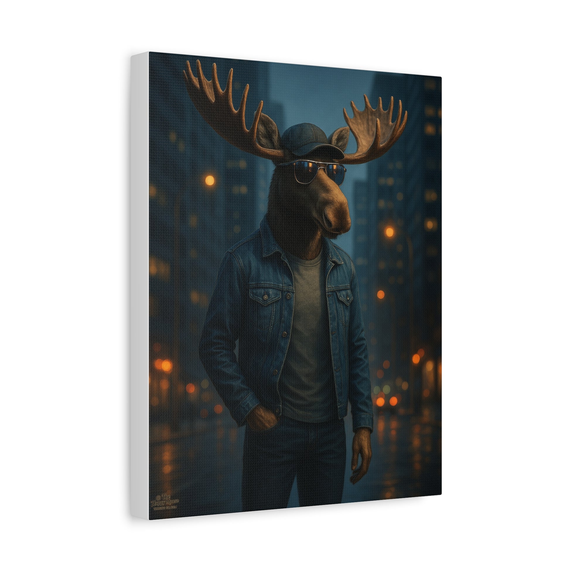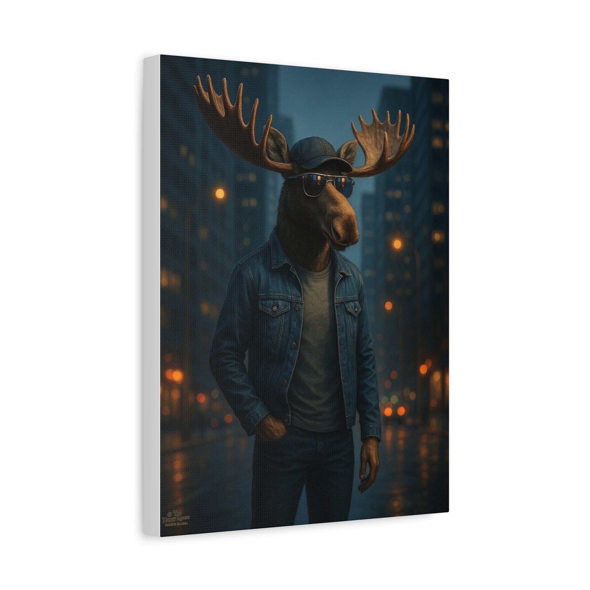 This stretched matte canvas brings a hint of playful surrealism to your walls. A moose-headed figure in denim strolls through a rain-washed cityscape, bathed in warm streetlight bokeh and cool twilight tones. The muted, painterly finish keeps reflections soft and colors deep, so the image feels intimate from across the room and richly detailed up close. Lightweight yet sturdy, the canvas arrives ready to hang and sits slightly proud from the wall thanks to the 1.25" profile—an artful statement that blends urban vibe with rustic charm. It’s the sort of piece that sparks conversation, quiet laughter, and a second look every time someone walks by.