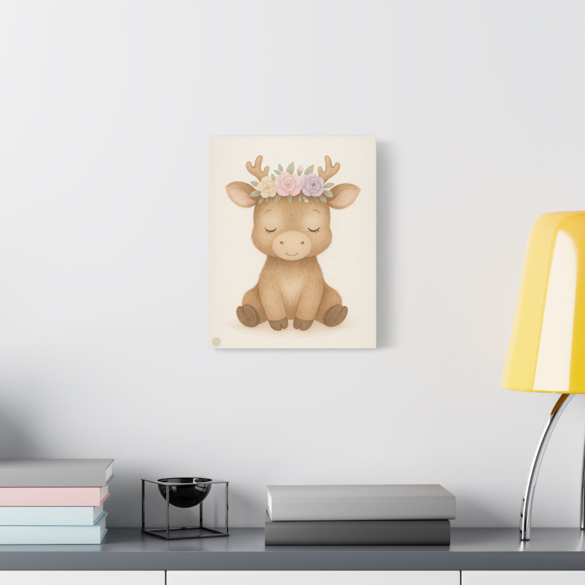 A soft, matte stretched canvas that brings a gentle woodland friend into a nursery or cozy corner. The illustration of a sleepy fawn wearing a delicate floral crown feels quiet and tender — a warm, soothing presence on a pale, speckled background. The 1.25" deep pine stretcher gives it a gallery-style profile while remaining lightweight for easy hanging. Natural textures and muted pastels let this canvas layer beautifully with wooden shelves, woven blankets, and handcrafted decor to create a calm, storybook atmosphere in a child’s room or a serene reading nook.
